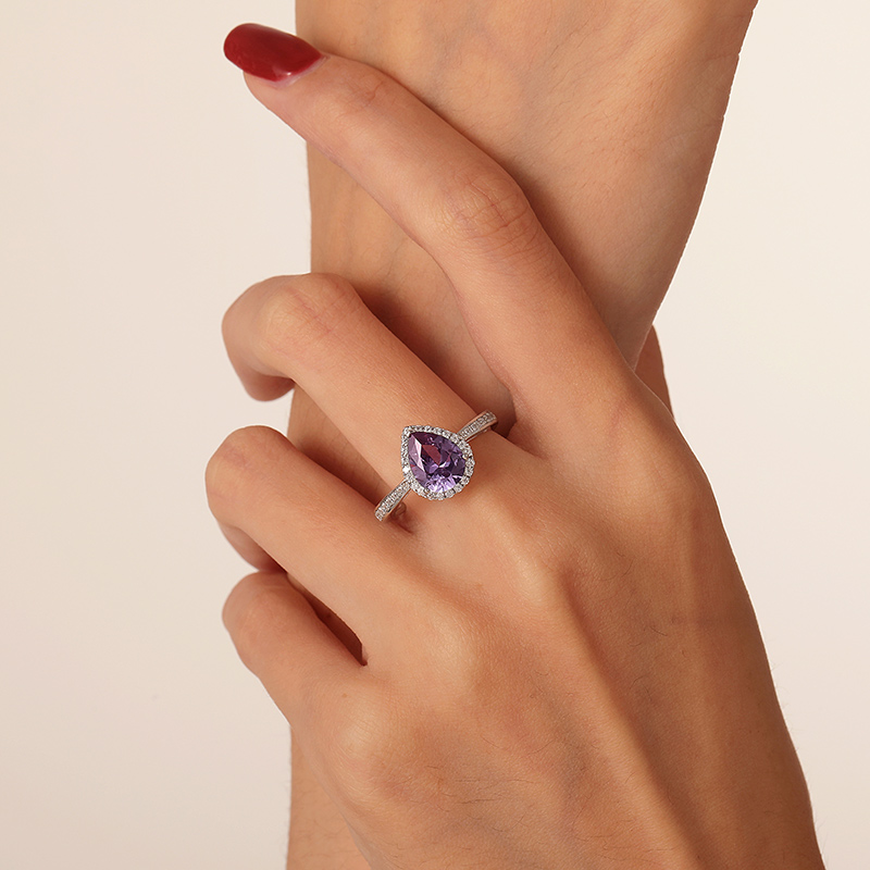 This Alexanderite ring is a true work of art, its main stone is the pear-shaped Alexandrite stone, a gemstone that refracts in different light and makes it impossible to take one's eyes off of it. The designer has skillfully incorporated this gemstone into the design of the halo pear ring with channel setting arm, making the whole ring look elegant and unique. More than just a piece of jewelry, this halo pear alexanderite ring is an expression of temperament that will allow you to exude confidence and charisma on any occasion.