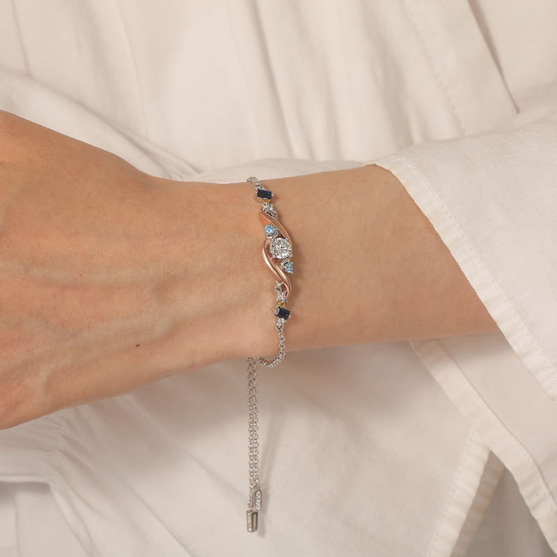 Jeulia luna astra star and moon two tone bracelet designed with amore’s signature twist chain anchors star-cut gems in cosmic disarray: peridot comets, sapphire moons, and citrine constellations scattered like fragments of a shattered galaxy. The clasp hides a crescent moon etched with astral coordinates—snap it shut to complete an unfinished orbit. Adjustable links let you tighten the sky to your wrist’s pulse or let it dangle loosely, a reminder that wonder thrives in controlled chaos.