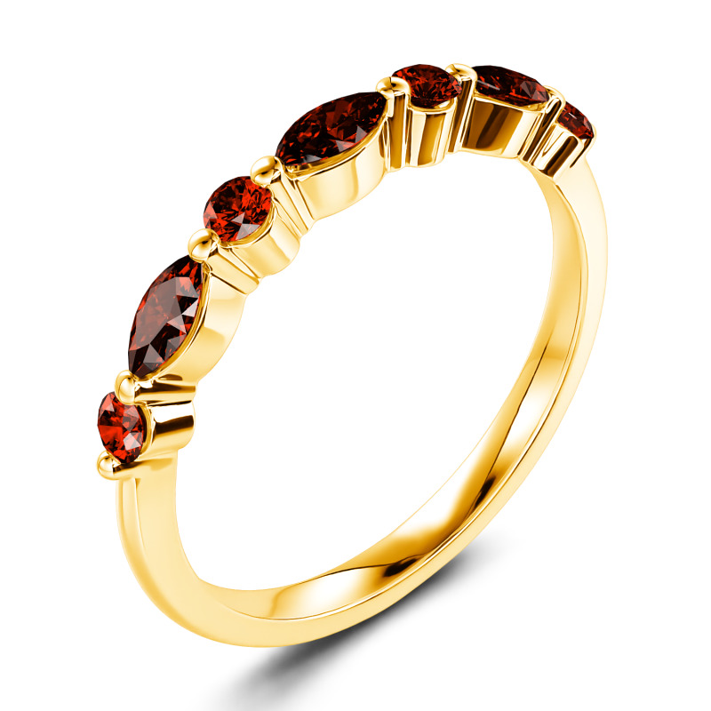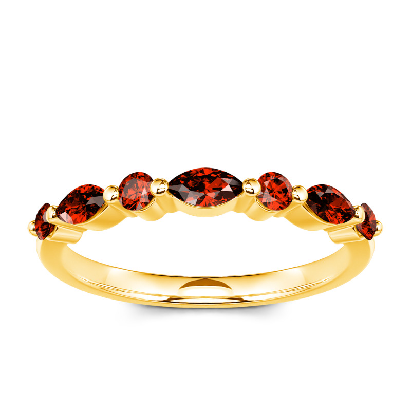 The lustrous moissanite stones are presented in an alternating fashion, set within marquise and round frames to shine gorgeously with the perfectly polished gold band. Vintage-inspired, a sparkling row of stones combines with the gleaming gold - a simple design that she can wear every day. Bring her a surprise on a special day. This gracious band is a thoughtful gift to commemorate your anniversary and memorialize your years spent together.