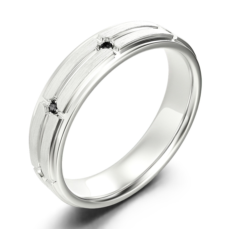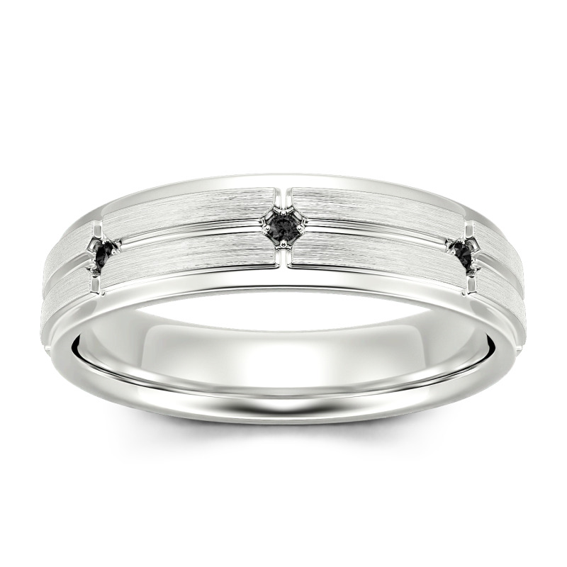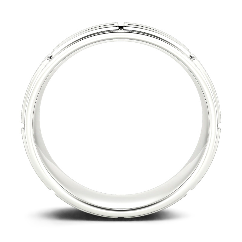 With smart details, this moissanite wedding band is a unique look for him. This sophisticated look showcases a grooved grid pattern dotted with shimmering round-cut stones. Stepped edges add further modern detail to the design. Begin your lifetime of love with this handsome wedding band for him.