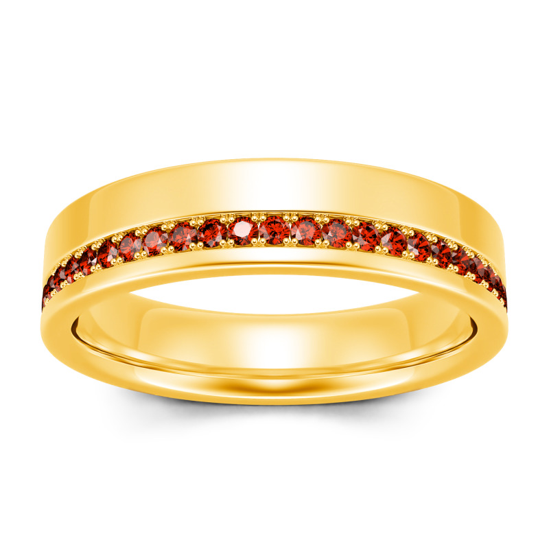 On your anniversary or wedding day, honor the man you love with a ring worthy of his affections. This unique design features a ribbon of petite channel-set stones along the edge of the modern polished look. Buffed to a brilliant shine, this ring is an elegant symbol of your marriage commitment.