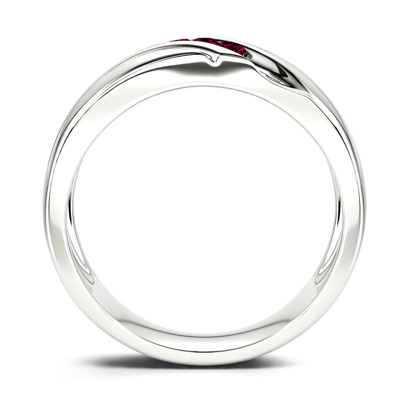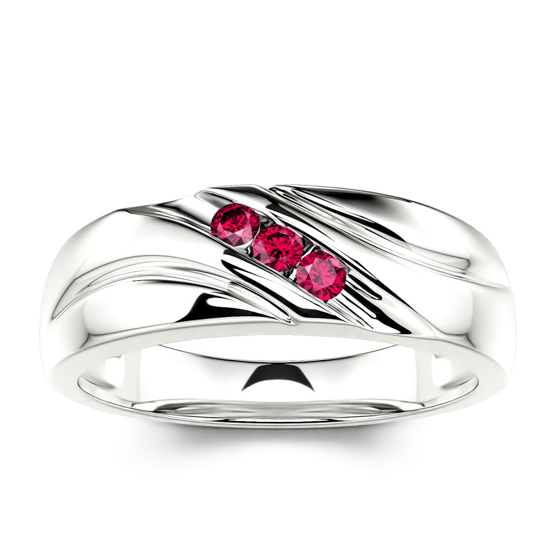 Contoured lines and a trio of moissanite flow along this handsome men's wedding band. This piece is highlighted by a diagonal stripe of three round stones adding a touch of eye-catching style. The perfectly polished finish, together with the striking shine of channel-set stones, is definitely a fashionable choice for him.