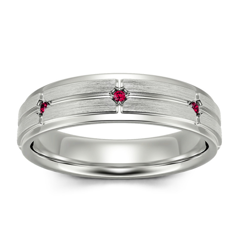 With smart details, this wedding band is a unique look for him. This sophisticated look showcases a grooved grid pattern dotted with shimmering round-cut stones. Stepped edges add further modern detail to the design. Begin your lifetime of love with this handsome wedding band for him.