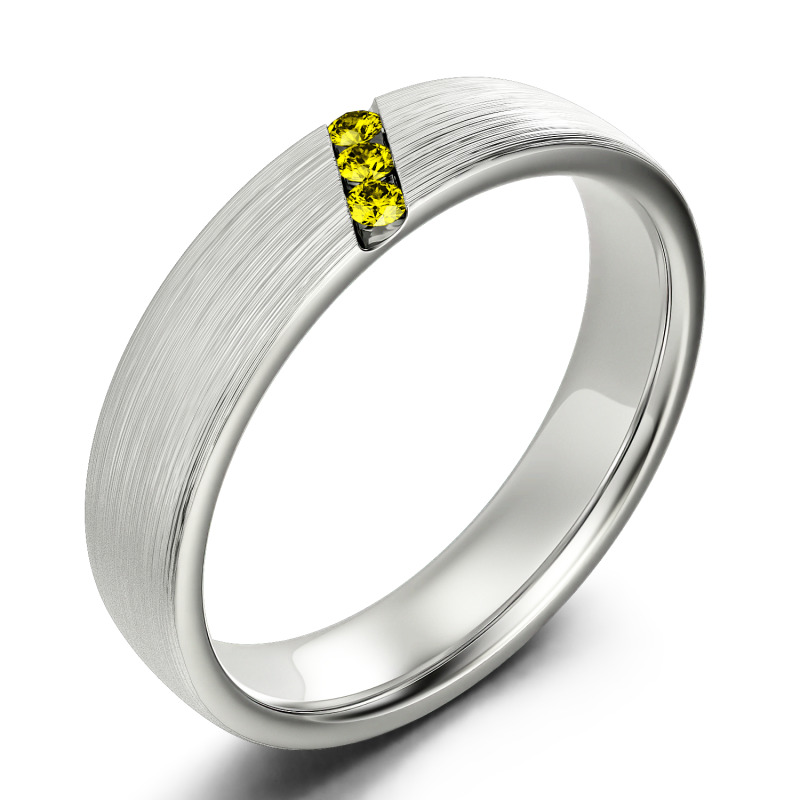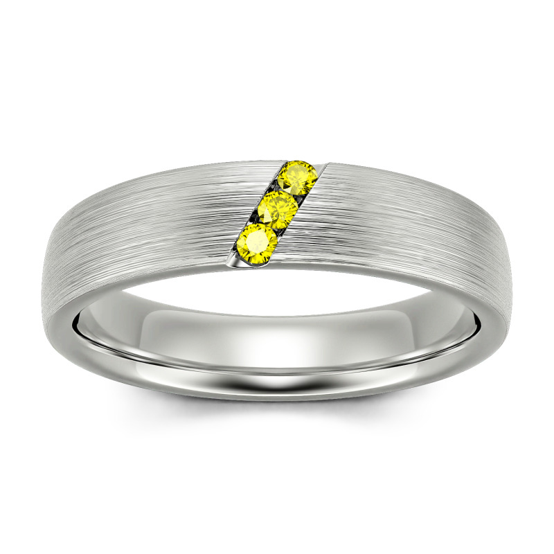 He'll appreciate the sleek design of this moissanite wedding band. A striking diagonal line of stones creates a unique, eye-catching design in this matte-brushed ring. The inside of the shank is rounded for comfortable wear. Buffed to a brilliant luster, this comfort-fit wedding band seals your vows in style.