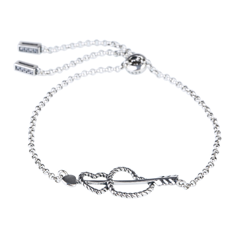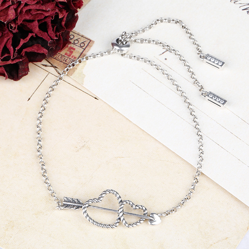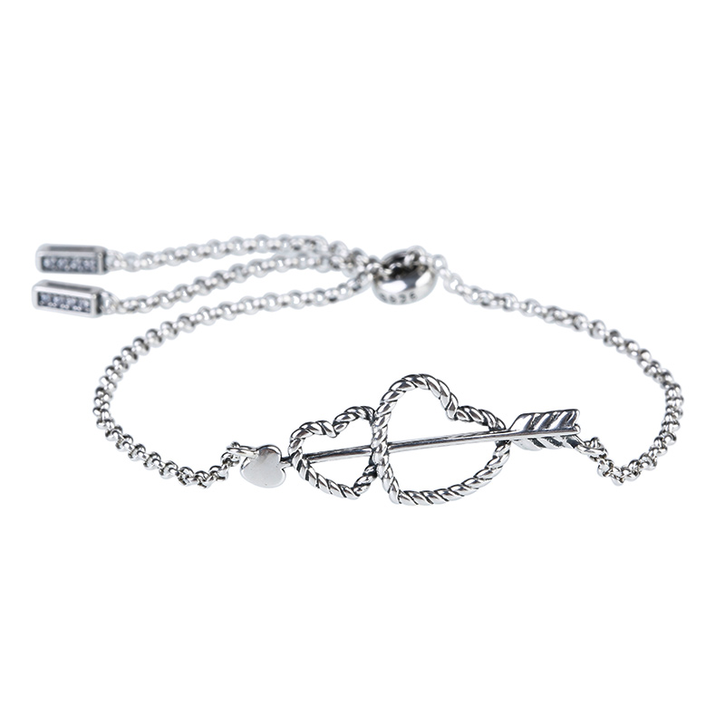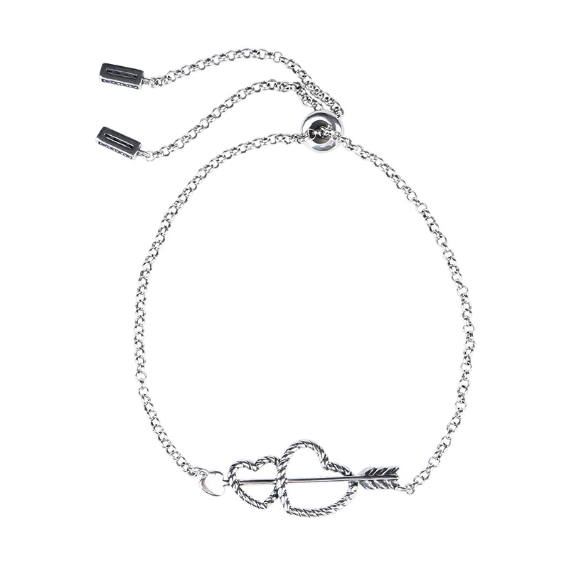 Celebrate your life with this bracelet. Crafted in oxidized silver, the bracelet shows unique and pristine beauty with its exquisite workmanship. Inspired from the Cupid's arrow, our designer created this piece. The bracelet features a Cupid's arrow getting through two hearts, which means love between a couple. The bolo bracelet is easy to adjust the size to fit for your wrist. Treat yourself or surprise her with this meaningful piece.