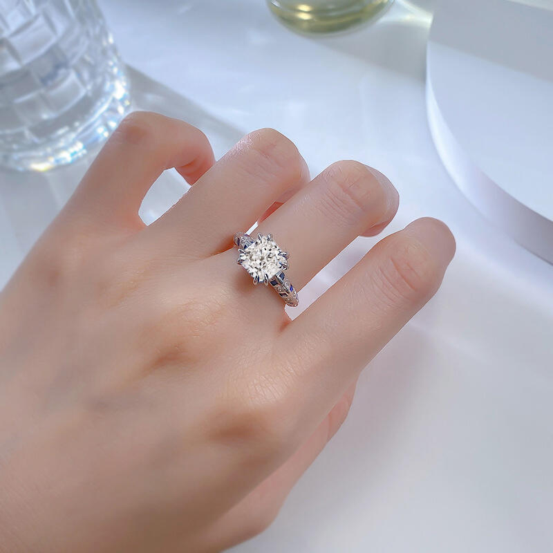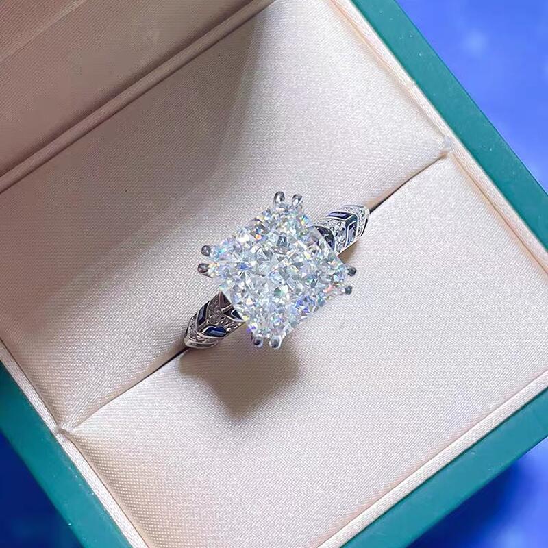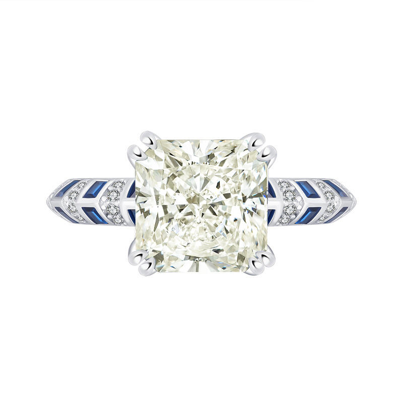This classic radiant engagement ring stands out for its unique design and superb craftsmanship. Its main stone is radiant cut , showing a clear and bright cream light and sparkling effect, as if it is a clear lake flowing on the fingertips. The bilateral color clashing blue and white ring wall design adds a stylish and modern touch to the whole ring, making the whole more gorgeous and noble. This engagement ring is not only a piece of jewelry, but also a work of art, which can perfectly show your love and pursuit of life. Wearing this classic engagement ring, you will be the center of attention, exuding confidence, elegance and romance.