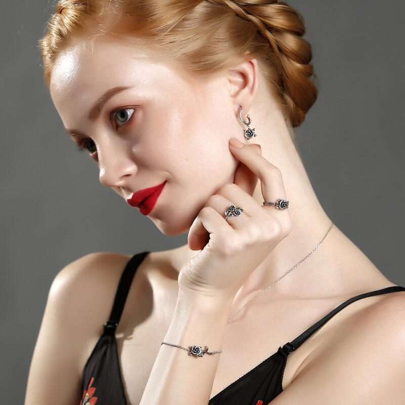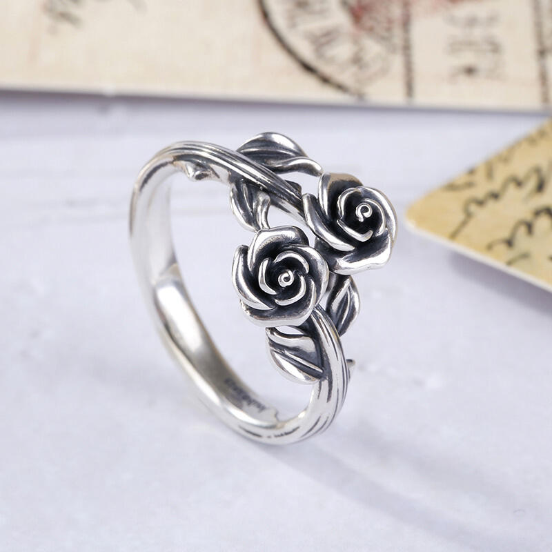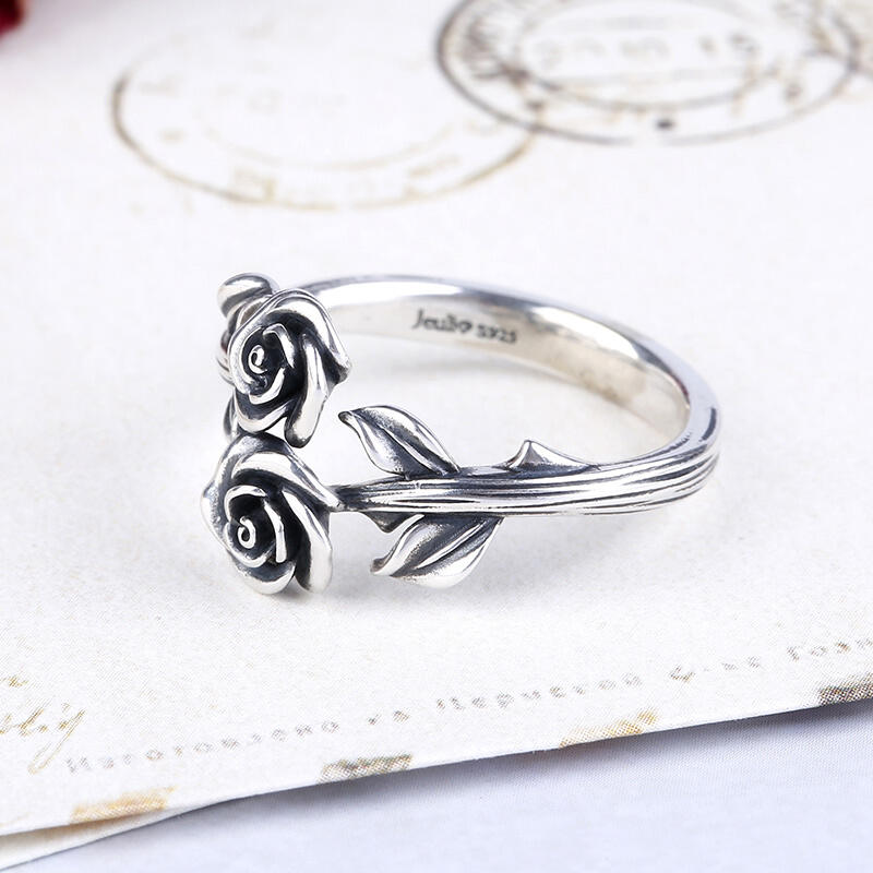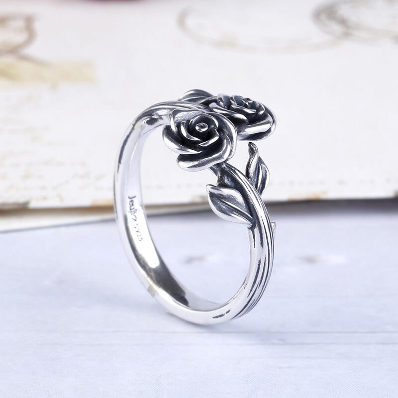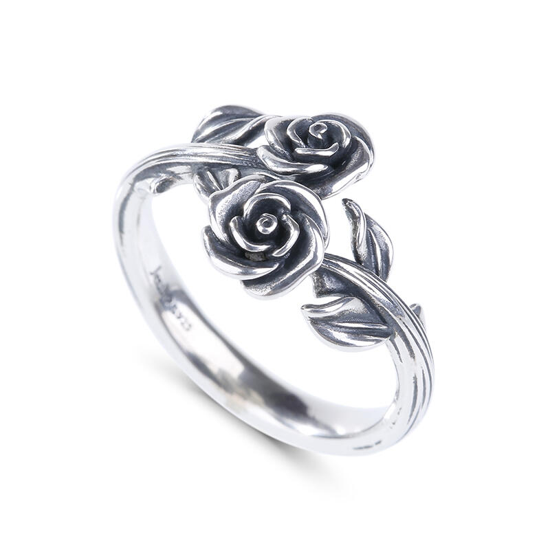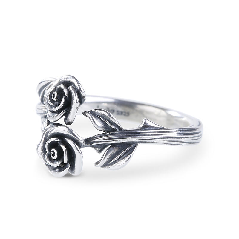This ring features two cross roses on the shank. Crafted in oxidized silver, the ring shows a unique look. The rose branches are delicately crafted with vivid grooves. It is a good choice for fans of oxidized silver jewelry. Never miss it!