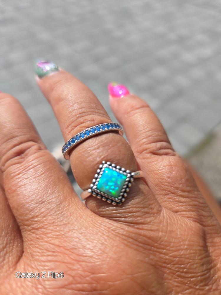 A unique and timeless ring you can wear daily, this opal ring is sure to be treasured by anyone you give it to. It showcases a beautiful green color opal encircled in a frame of rope and beads. The opal stone has different flashes of color when it hits the light. This beautiful style is a perfect gift for any lady or a great accessory to add to your own collection.