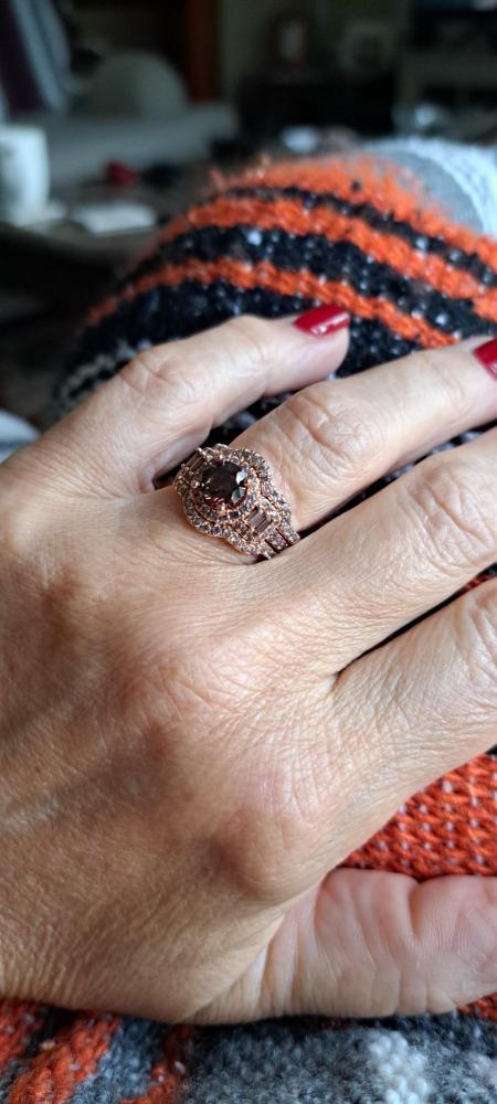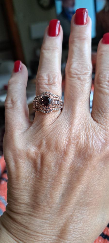 I love my ring its beautiful ! But its not all chocolate stones as picture show. The middle round still e and side stones are chocolate the two surround rings are white..Free package - by Ann Marie,