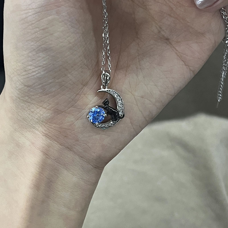 Crafted in 925 sterling silver, this "Black Cat on the Moon" custom birthstone necklace by sterling silver captures the spirit of a cat playing on a crescent moon. At the center of the moon necklace is the elegant silhouette of a cat, pawing at a customization round birthstone “ball of wool”. The moon pendant is finely finished and pave-set with a row of starbursts that mirror the main stone. The center stone offers a choice of 12 birthstones, from sapphire, a symbol of loyalty, to amethyst, a symbol of wisdom, each of which infuses this piece with a unique personality. Whether it's a birthday gift or an everyday treat, this cat necklace will have the wearer feeling the poetic romance of “moonlight and catwalk”.