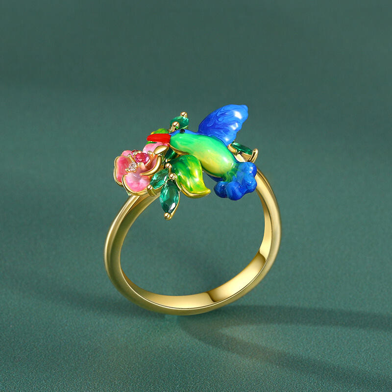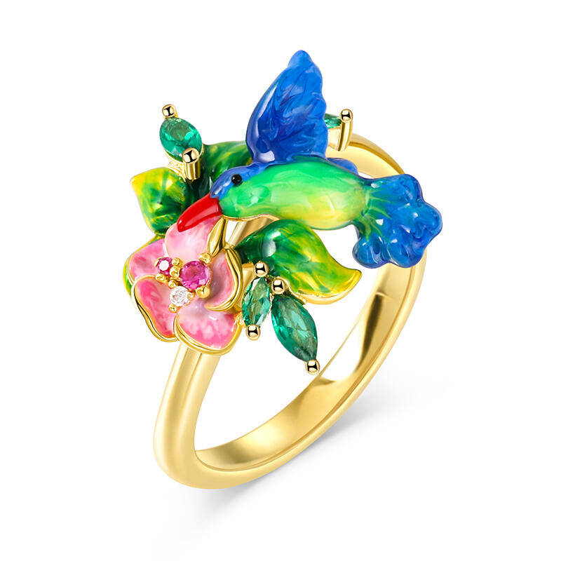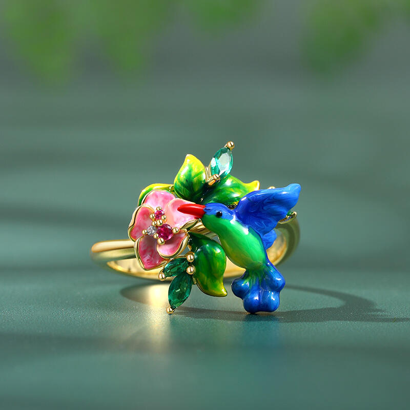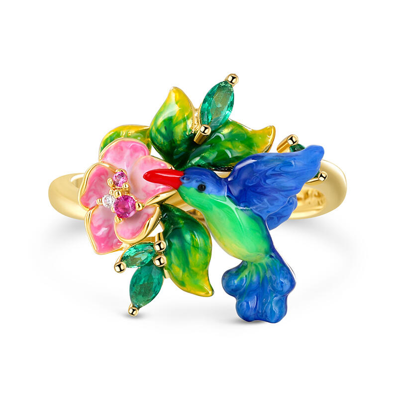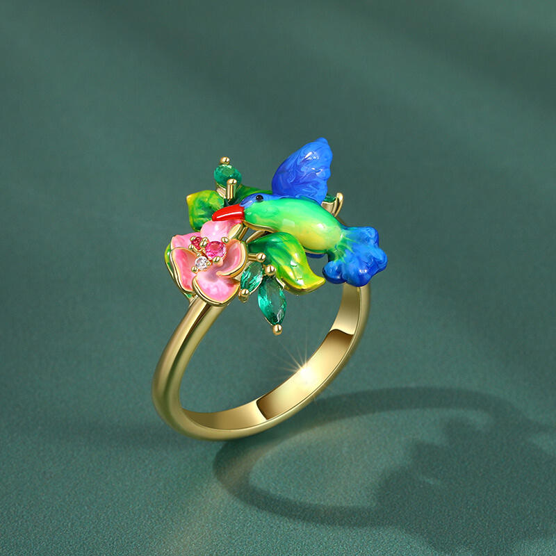You can wear them stacked together or separately. This beautiful ring have been created from sterling silver with hand painted enamelling, each ring is adorned with a lovebird and flowers. It looks like a hummingbird is hovering over the flower on your ring! Elegant and unique!