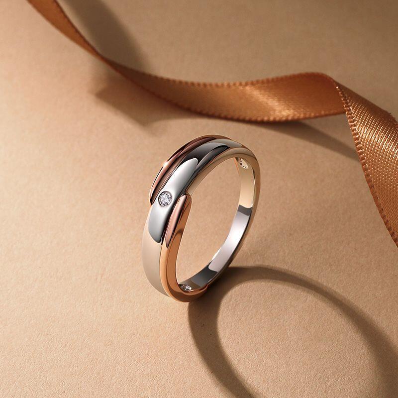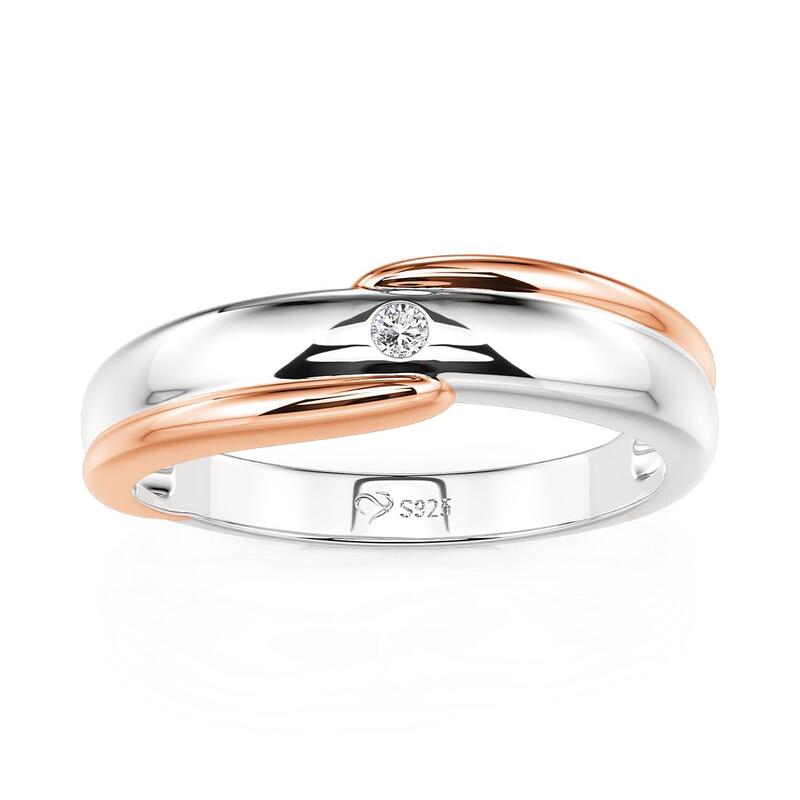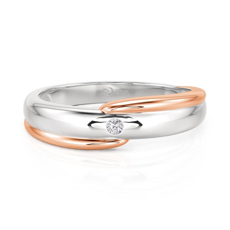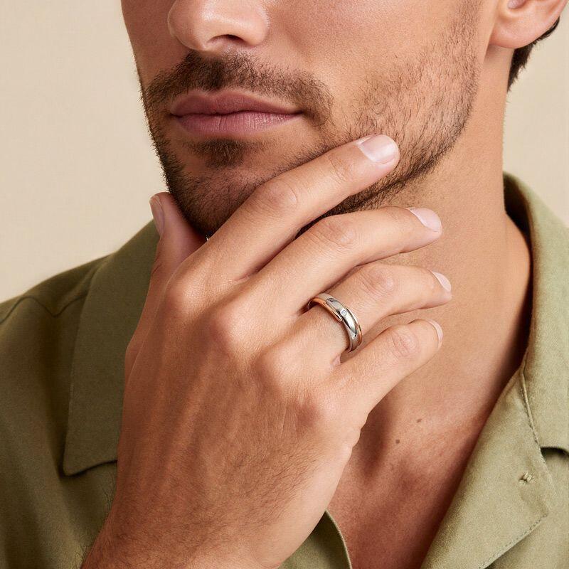 A sleek band in rose gold and silver glides along a diagonal split, its clean geometry brightened by a single stone set discreetly at the edge. Understated yet intentional - this Jeulia two-tone ring bridges casual ease and refined polish - for the man who knows details speak softly but carry weight.