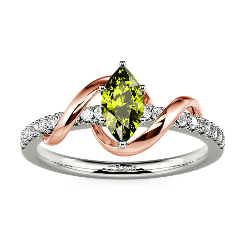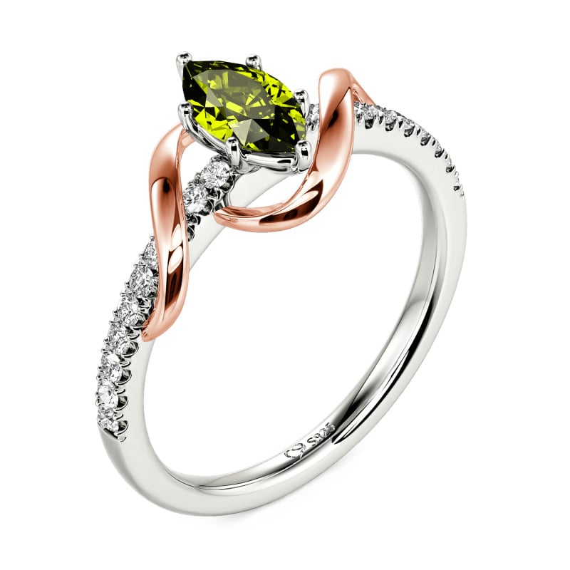 Silver in color throughout, this marquise cut engagement ring exudes elegance and class. The center main stone is a brilliant horse-eye stone that displays a captivating sparkle with its unique cut. A delicate rose gold ribbon surrounds the main stone, adding warmth and luxury. The small diamonds pave-set on the engagement ring wall sparkle with a mesmerizing light, enhancing the overall sense of magnificence. What's special about this custom engagement ring is that not only can you customize the color of the main stone, but you can also change the metal color to suit your personal preference, making each ring a unique and exclusive piece. Whether as an engagement ring or for everyday wear, it will be the perfect choice to convey love and beauty.