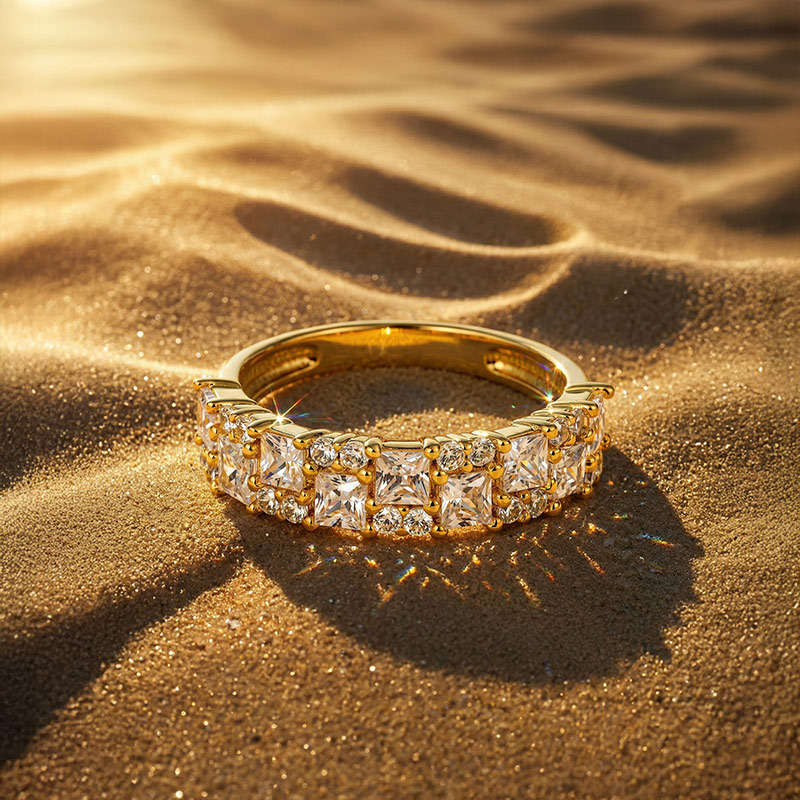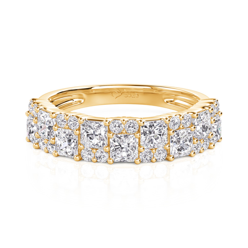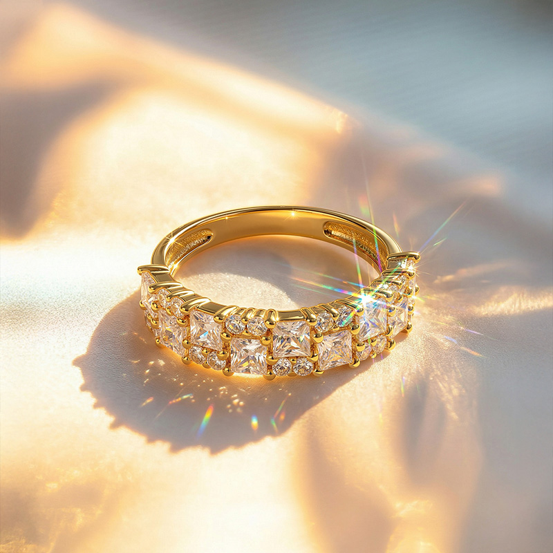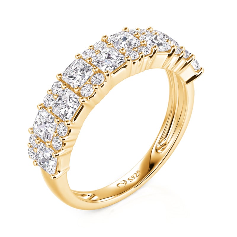 This Jeulia Art Deco women’s wedding ring seamlessly blends the cool geometry of the Asscher cut with the warm radiance of a round stone, embodying the modern elegance of the 1920s. The center stone features an Asscher cut, whose signature stepped facets and square silhouette create deep, mirror-like reflections under the light, exuding a vintage yet understated charm. Round-cut diamonds are arranged alternately on either side of the center stone; their smooth curves engage in a rhythmic visual dialogue with the Asscher’s sharp lines, as if the notes of the Jazz Age were dancing across your fingertips. The ring shank features a gently arched geometric profile with a mirror-polished finish that reflects the gemstones’ fire, creating a harmonious interplay of light. The overall design is minimalist yet architecturally striking, blending the opulent charm of the Art Deco era with the versatile appeal of a modern wedding band. Whether worn alone as a subtle statement of individuality or stacked with an engagement ring to create rich layers, this half eternity wedding band allows the wearer to effortlessly transition between everyday life and special occasions, bearing witness to every moment of an elegant commitment.
