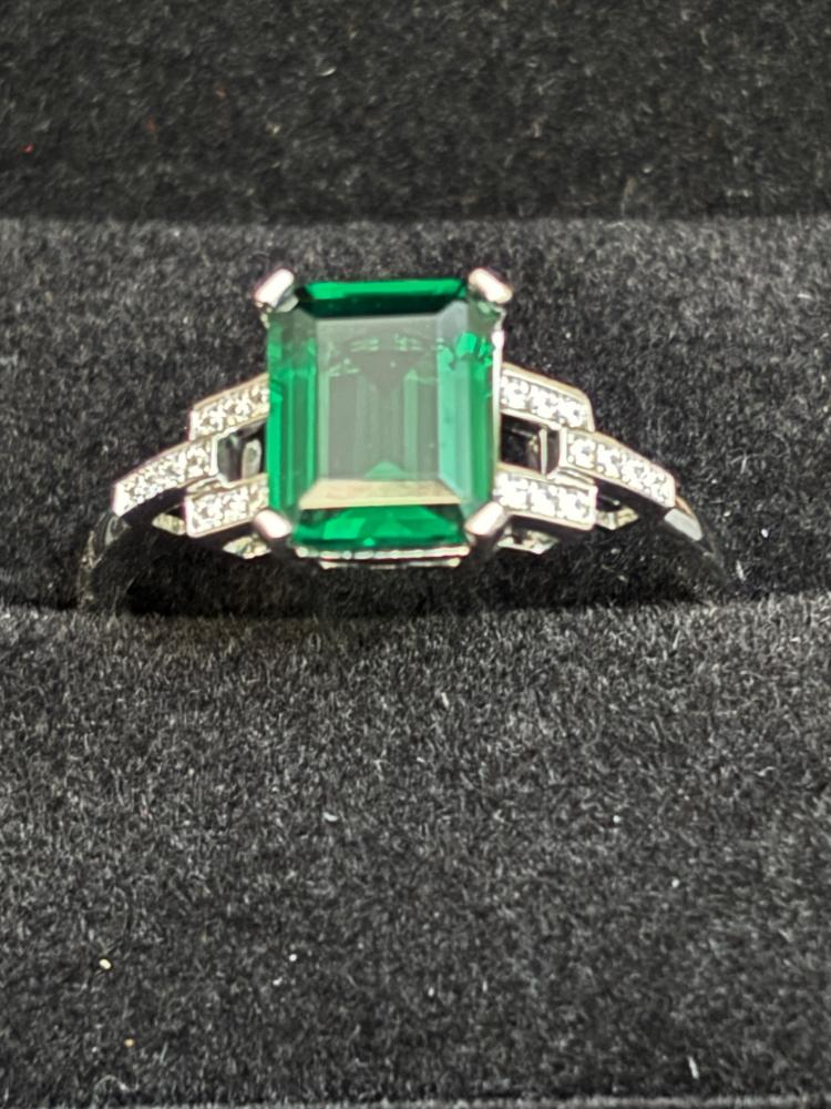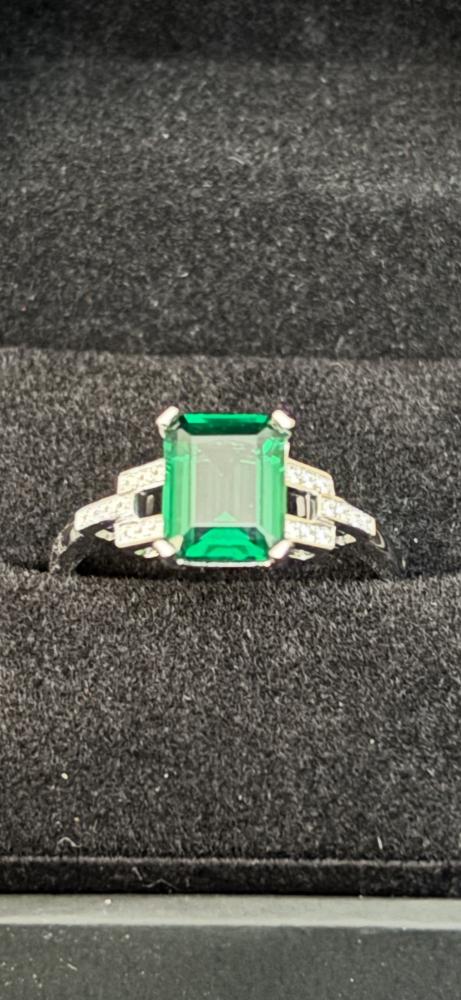 Graceful and glamorous, this art deco style ring delivers eye-catching style. An emerald cut center stone shimmers at the center, and the geometric shank sparkles with more smaller round stones. All the stones sparkle perfectly from every angle, making the ring an eye-catcher everywhere. Elegant and modern, this look is sure to bring her instant compliments.