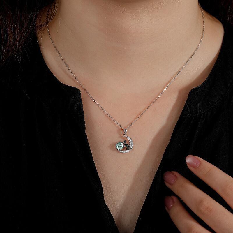 This Jeulia Moon Cat Moss Agate Necklace, crafted from sterling silver, captures a fairy-tale scene around your neck. A playful kitten reclines upon a crescent moon, its front paws gently nudging a round moss agate bead. The crescent's tip features engraved starbursts, while miniature silver moons adorn the chain links. When worn, the agate bead spins like a cat's endless game. This moss agate cat on the moon necklace pairs perfectly with forest-inspired outfits for woodland strolls, while its mossy patterns reveal an impressionistic landscape under candlelight during evening dates.