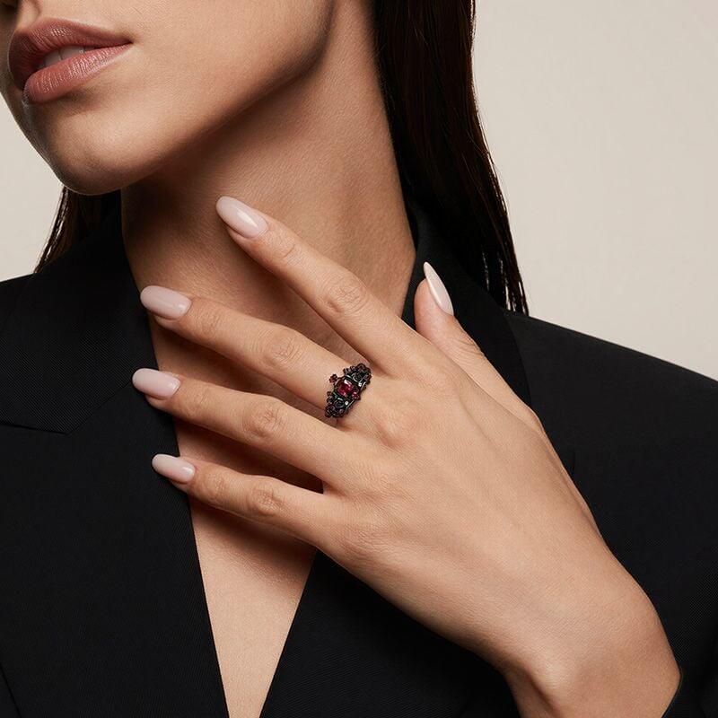 This Jeulia “Queen of the Night Rose” cushion-cut ring captures the mystery of Gothic aesthetics and the grandeur of a queen’s presence on your finger. The ring shank features sharp thorn branches intertwined to form the outline of a crown. Each precision-carved thorn exudes a cool, metallic texture, while blooming roses adorn the branches. Their layered, unfurling petals create a dramatic interplay of softness and strength against the sharpness of the thorns. Set at the center is a rose-red cushion-cut gemstone. Its full contours and rich rose-hued luster shine even more brilliantly against the dark ring shank, resembling a rose heart burning in the night. The overall design exudes visual tension, embodying both the commanding presence and nobility of a queen while subtly conveying the profound symbolism of “a rose born from thorns.” This black crown ring is perfect for wearers who seek individuality and strength, transforming every gesture into a magnificent moment of a queen’s coronation in a dark fairy tale.