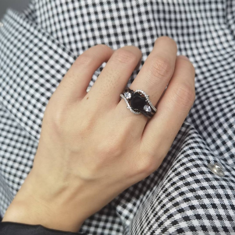 This Jeulia Black Heart Thorns Three Stone Ring Set features an onyx heart floating between two pear-cut white zircons, with their icy glow stark against the matte black band. The enhancer coils like thorned tendrils, pavé zircons tracing its path like frost on midnight branches. Stack the black ring set: the stones form a celestial triad; separate them: the heart stands alone, a solitary monarch in a star-flecked court.