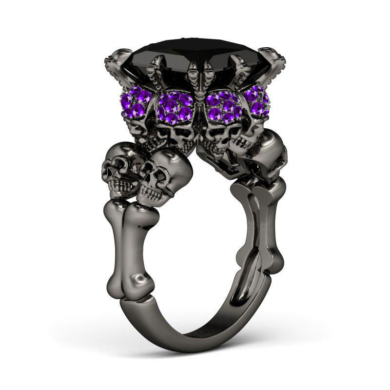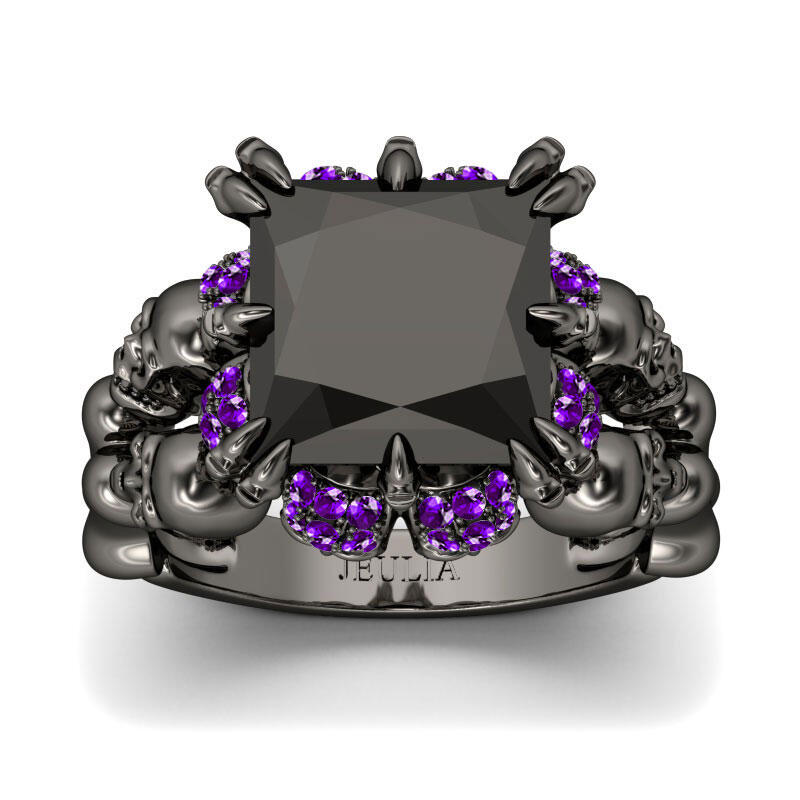 Inspired from Halloween, crafted in black tone sterling silver, this cool skull ring features its four skulls on the band. They will show a unique look on your finger. The hidden skulls under the mount will shine brilliantly with every movement of your finger. Moreover, the ring is set with a 9mm princess-cut fancy black center stone, which makes the ring a very stylish piece. If you are looking for unique skull jewelry, then take this masterpiece. It won't disappoint you!
