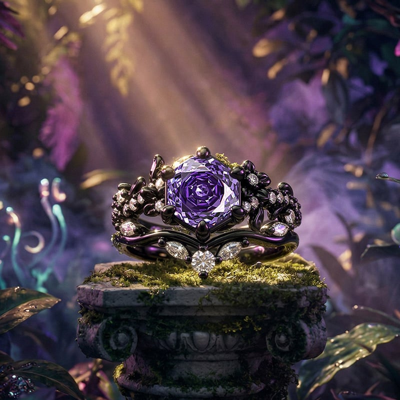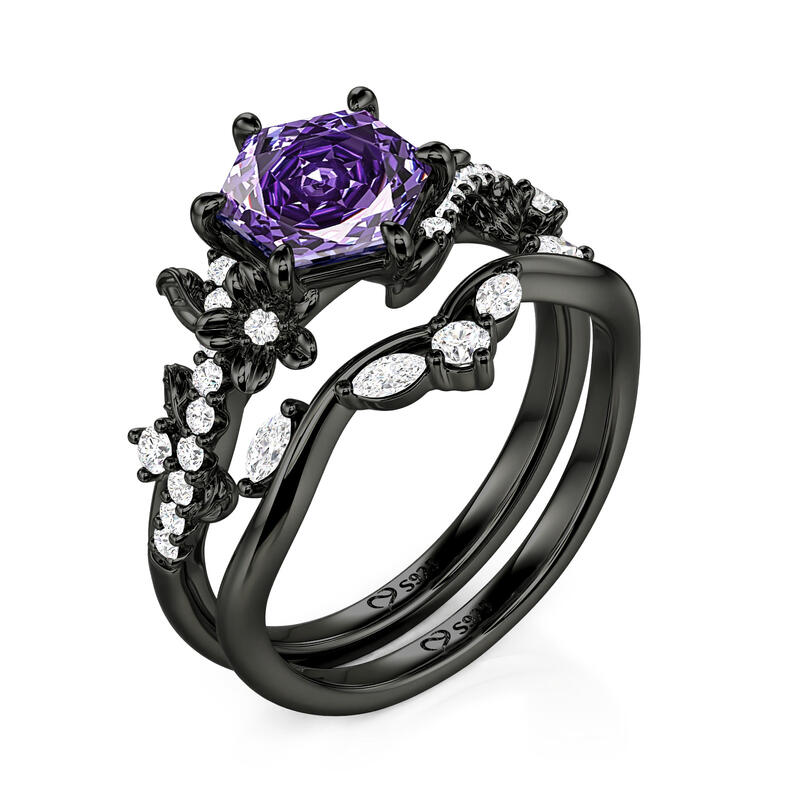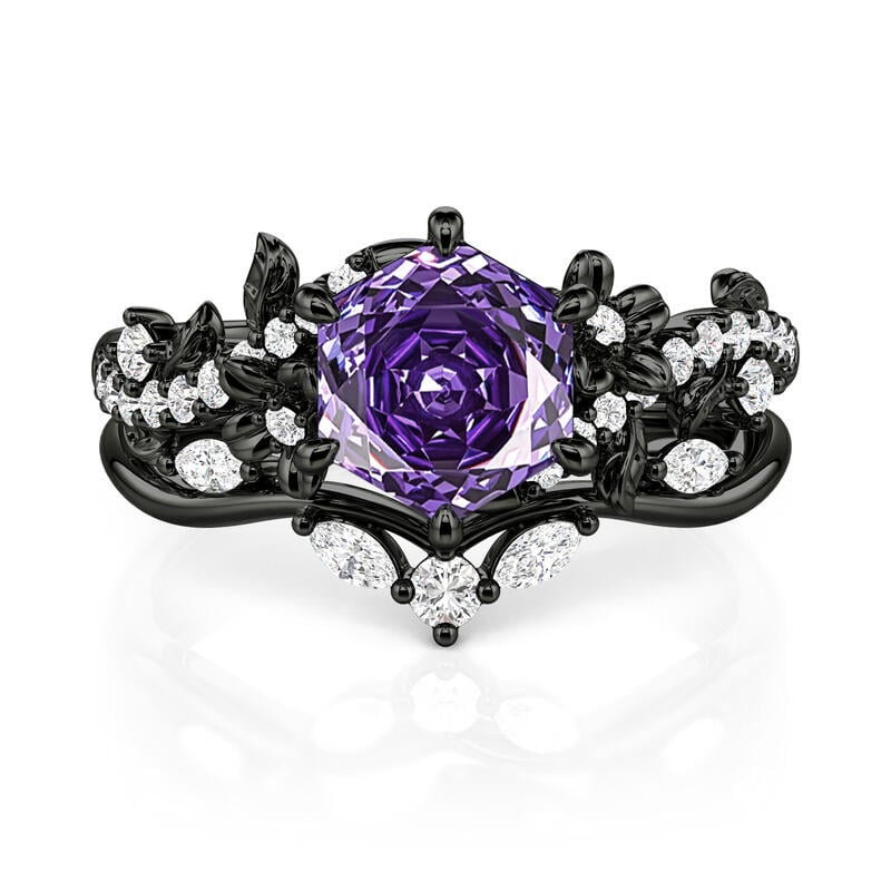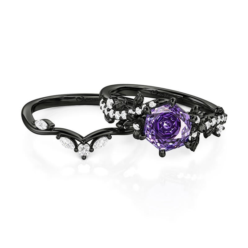 Jeulia Black Vine Purple Rose Cut Engagement Ring Set