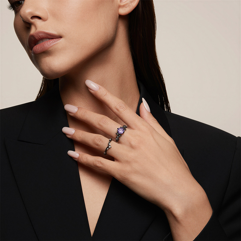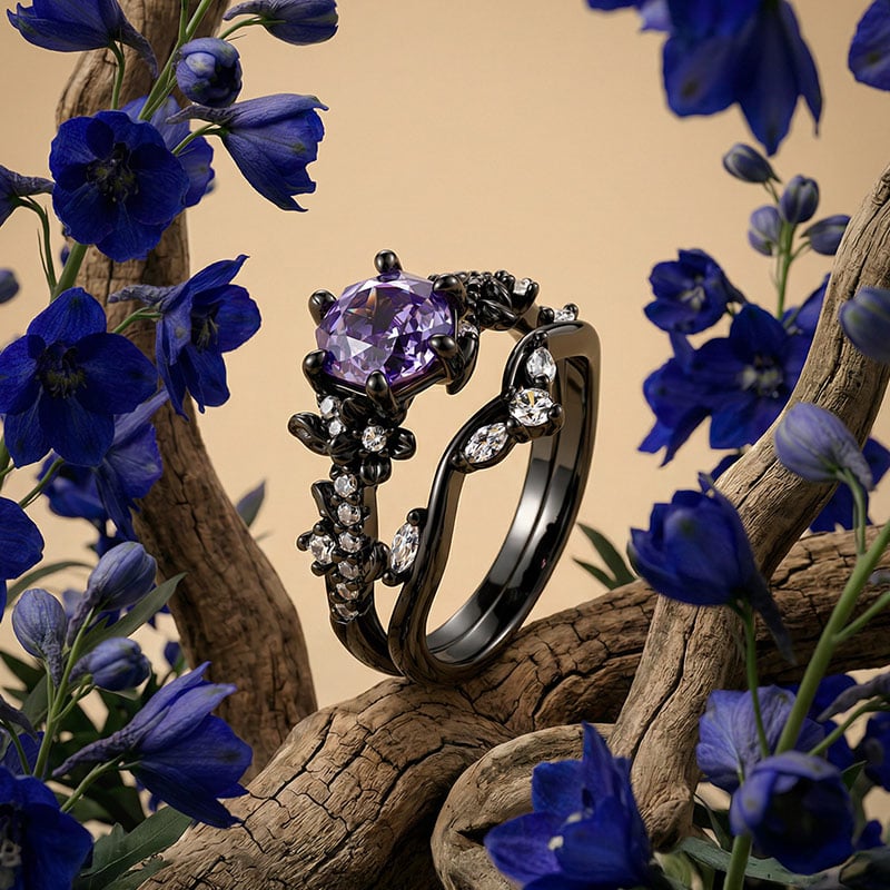 Step into a world of dark enchantment with the Jeulia Black Nature Inspired Purple Rose Cut Engagement Ring. This gothic ring is crafted with a bold black finish and features an intricate, nature-inspired band that mimics the organic texture of climbing vines. At its center, a magnificent purple rose-cut stone blooms with royal intensity, held in place by delicate floral prongs. Shimmering marquise and round-cut accents are nestled within the foliage, adding a brilliant contrast to the deep, mysterious tones of the metal. Blending a sophisticated gothic aesthetic with botanical grace, this black ring set is a striking choice for those who seek a unique and poetic symbol of their love.