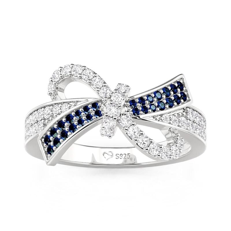 Tie a touch of elegance into your everyday look with the Jeulia Blue Bow Knot Ring. Crafted in lustrous sterling silver, this bow ring features a delicate ribbon design Pavé-set with a stunning contrast of brilliant white and deep sapphire-blue stones. Symbolizing the unbreakable bonds of love and friendship, its feminine silhouette transitions flawlessly from a daytime office accessory to a sophisticated evening accent. Whether it’s a meaningful gift or a personal style statement, this pave ring offers a timeless blend of playful charm and refined luxury.