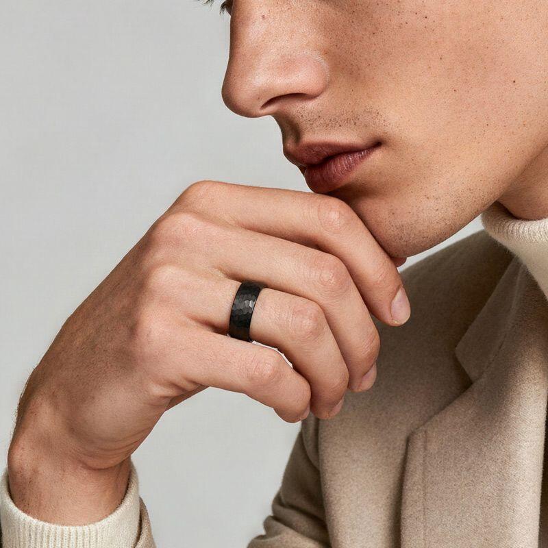 The Jeulia Men's Brushed Black Hammered Tungsten Ring combines rugged texture with modern durability for a striking, modern look. Crafted from scratch‑resistant tungsten carbide with a deep black finish, the band features a hammered surface that catches light across its faceted planes, creating a striking, industrial aesthetic. Comfort-fit interiors ensure all‑day wearability, while the heavy, solid feel of tungsten communicates longevity and strength. Ideal for everyday wear, as a wedding band, or as a bold fashion statement, this black ring pairs well with both casual and tailored styles and suits anyone seeking a contemporary, low‑maintenance piece that still stands out.