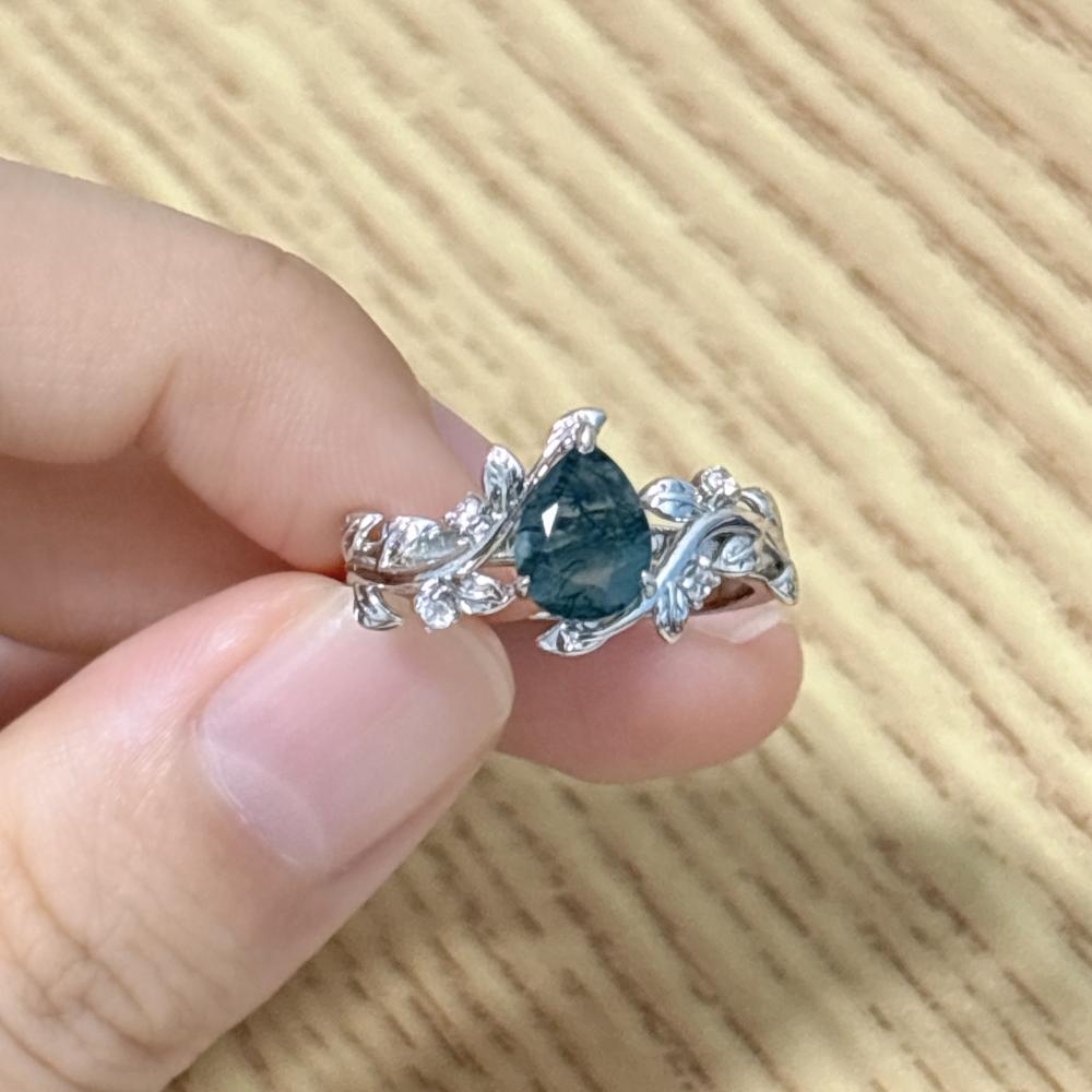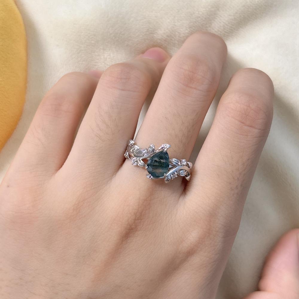 Jeulia Bypass Pear Cut Moss Agate Engagement Ring with Vine Leaf