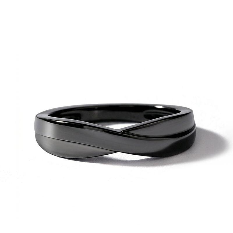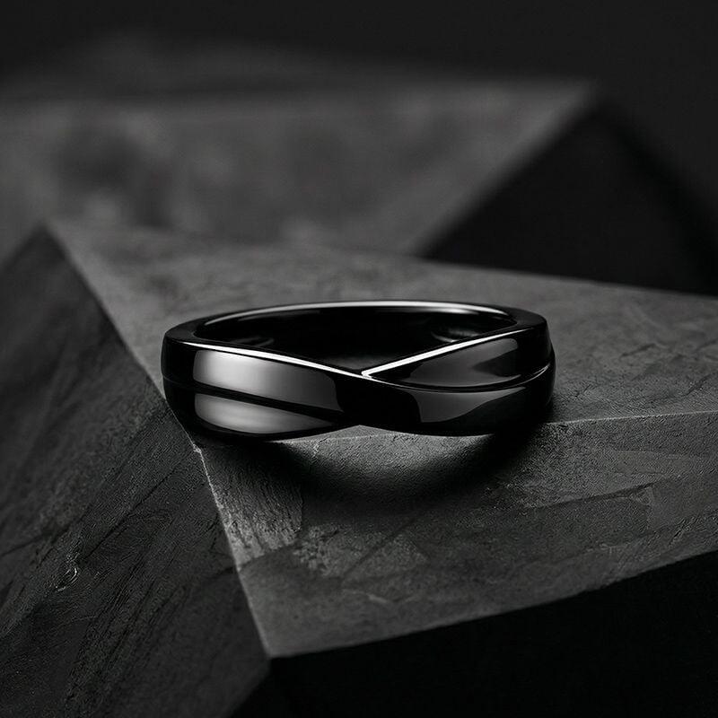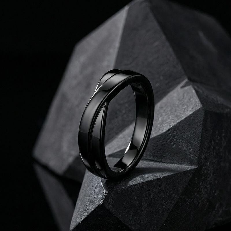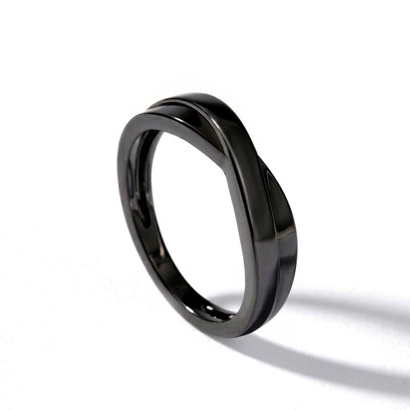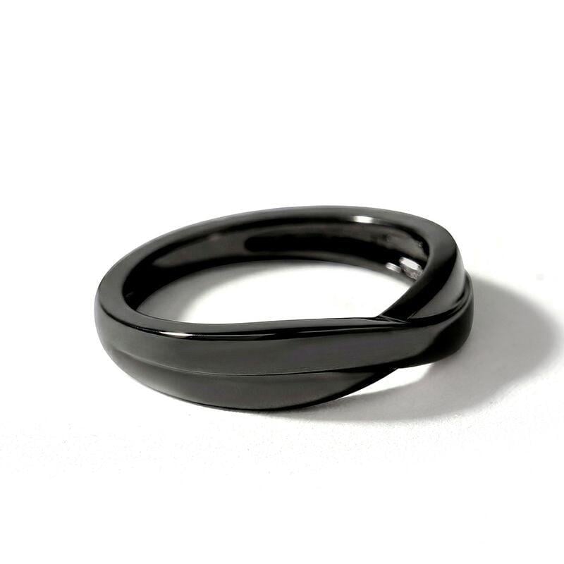 A sleek black band with a subtle crossover detail offers modern minimalism with effortless wearability—the polished finish and clean lines create a low‑profile silhouette that slides comfortably onto the finger for everyday wear. Thoughtfully balanced in proportion, the crossover adds visual interest without bulk, making this black ring equally suited as a stylish statement piece or a refined everyday band. Versatile and understated, this minimalist stackable ring is an excellent choice for gifting, coordinating with other jewelry, or for anyone who prefers a contemporary, neutral look with timeless appeal.