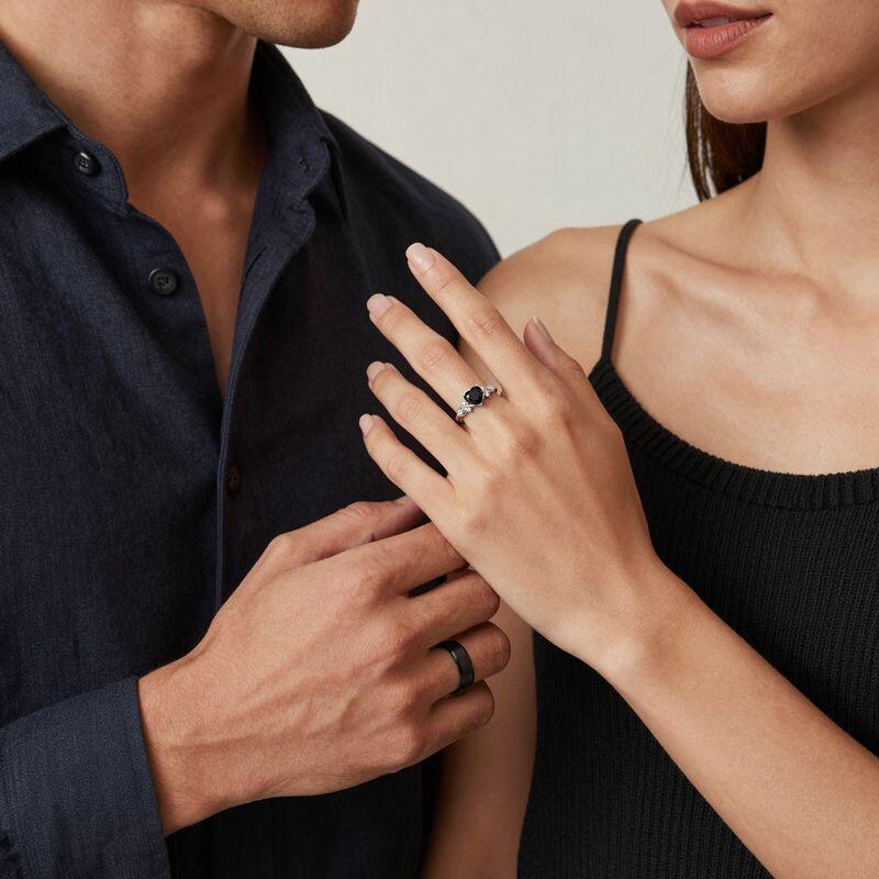 This Jeulia couple’s ring set unites shadow and softness in a shared dark palette: his band, a wide matte circle brushed to a quiet, substantial finish, speaks in clean lines and softened edges—grounded, silent strength. Hers winds like a delicate vine, cradling a heart-shaped dark stone flanked by pavé gems that trace each curve like dew on leaves. Together, this black ring set mirrors a bond where his steady presence meets her intricate grace—two voices, one harmonious dusk, worn as a quiet testament to love that thrives in both stillness and bloom.