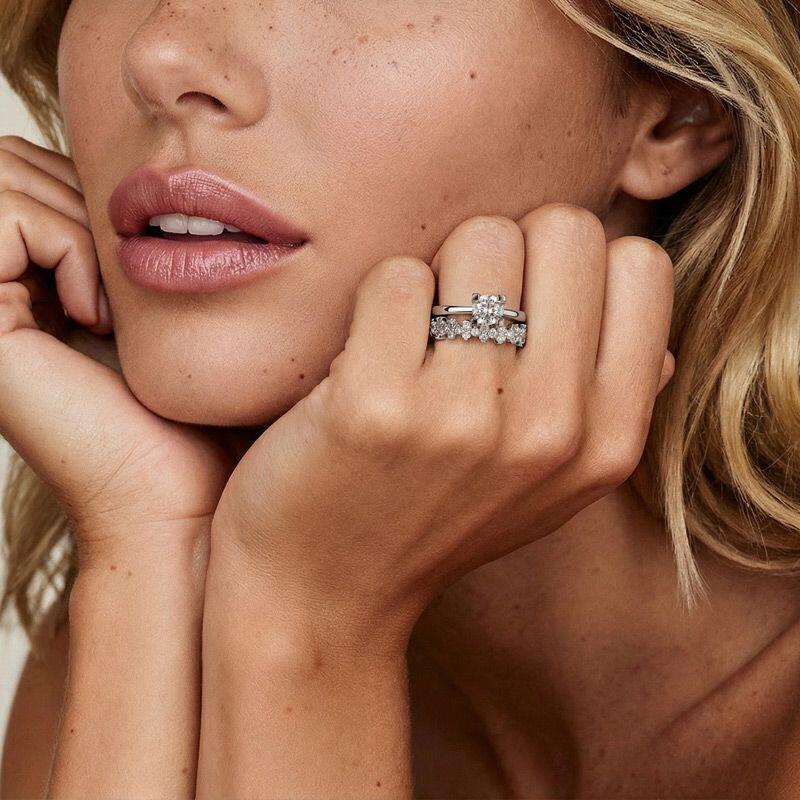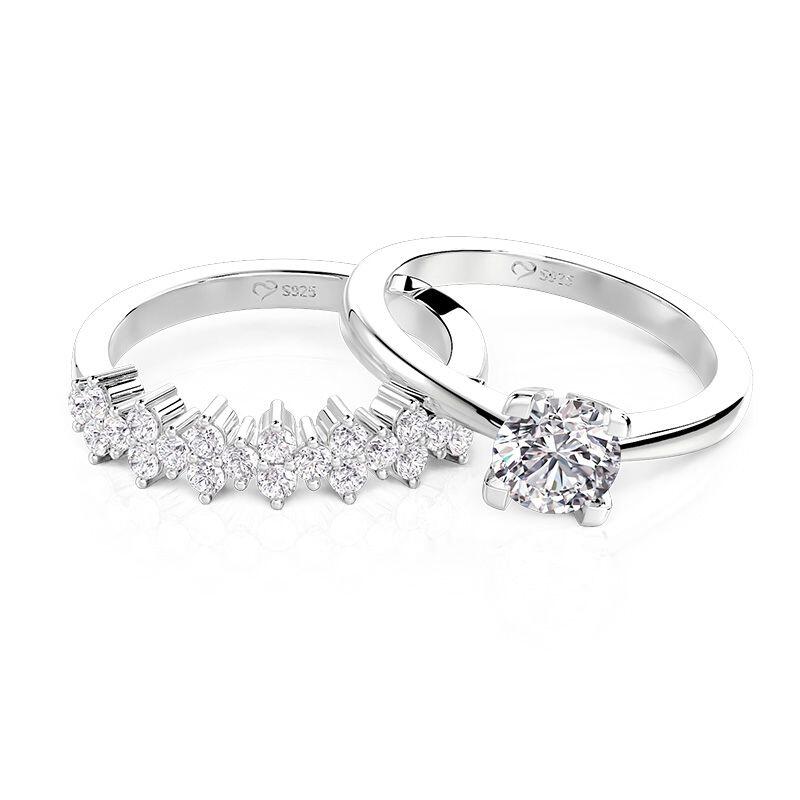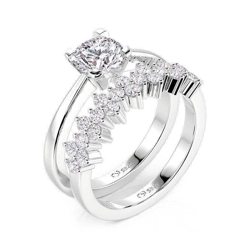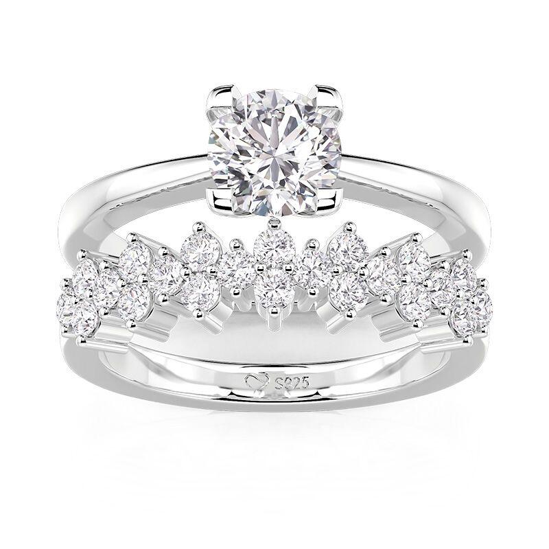 Embrace timeless romance with the Jeulia classic cluster round cut bridal set. This exquisite two-piece ensemble features a main ring with a four-prong round-cut center stone for understated elegance, paired with a band adorned with a sparkling cluster of small round stones to add dimensional brilliance. Crafted in sterling silver, this engagement and wedding ring set masterfully blends traditional bridal charm with modern layered sparkle, creating a cohesive and dynamic look. Perfect as a striking wedding-day statement, this silver bridal ring set transitions seamlessly into an enduring, polished daily accessory.
