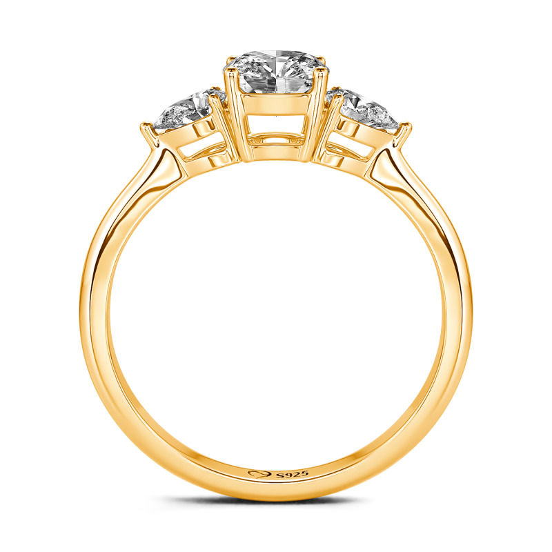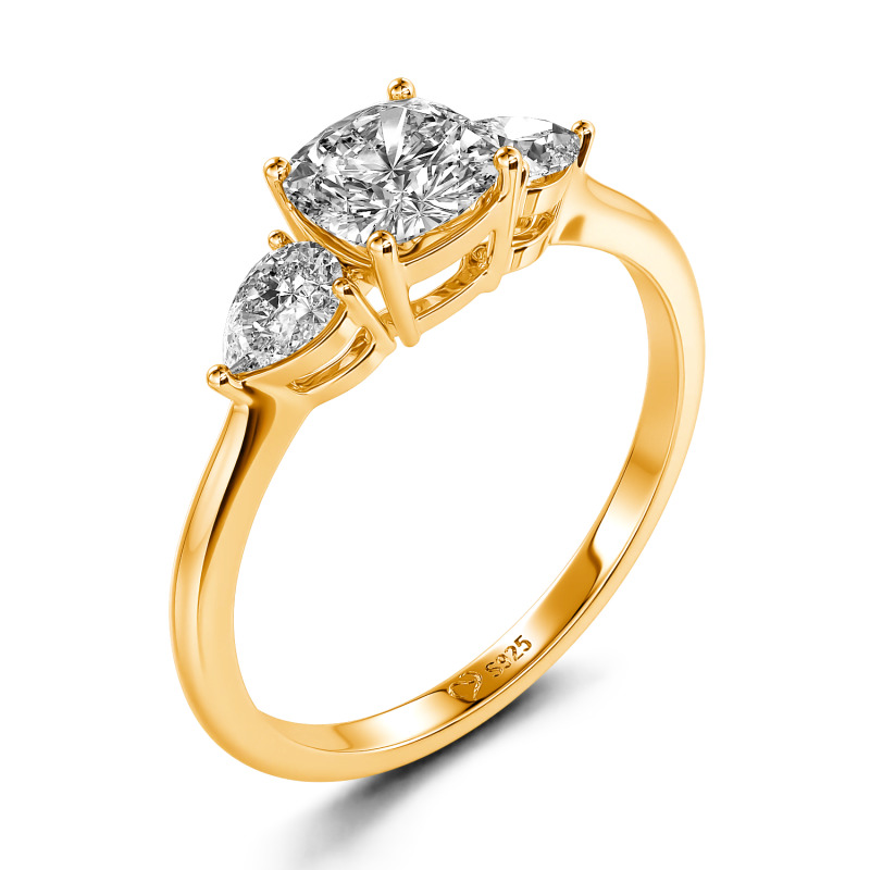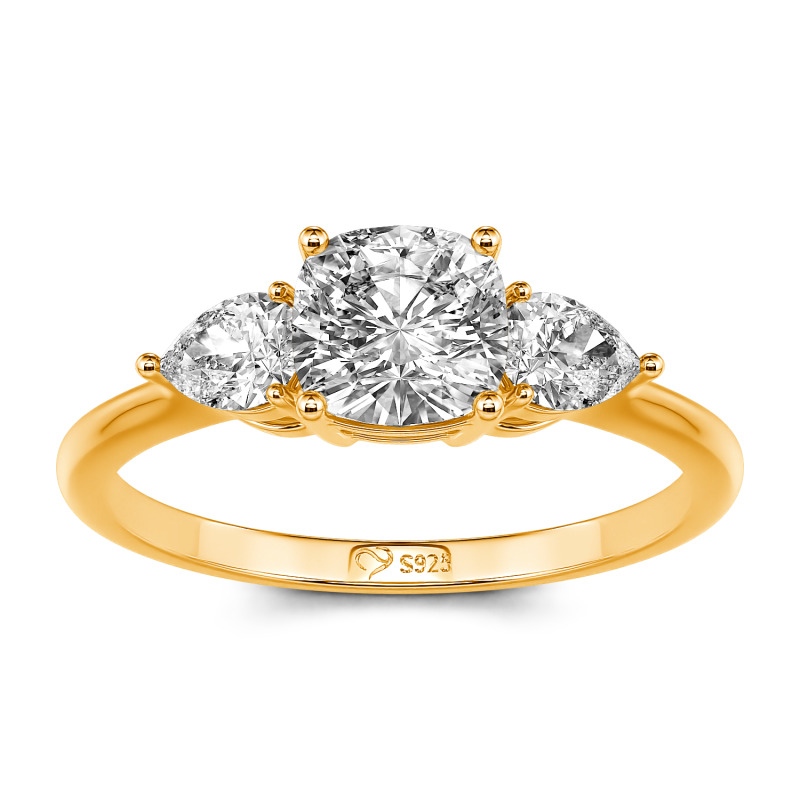 Sweet, simple and delicate ring. Great for creating a minimalist look or for stacking. It adds a fun splash of colour to your look! This ring has a cushion cut with pear shaped stones on either side for a delicate look!