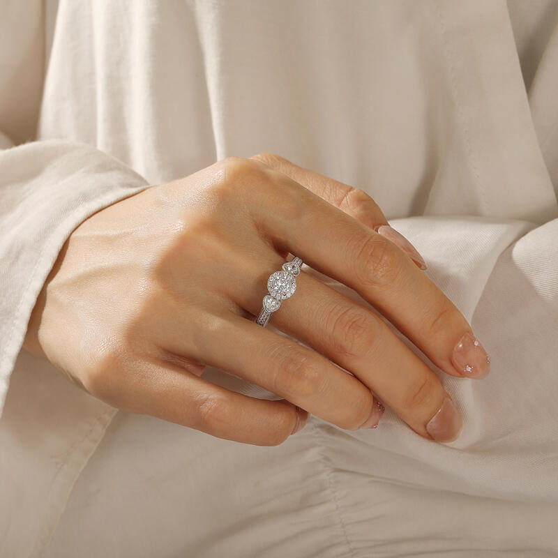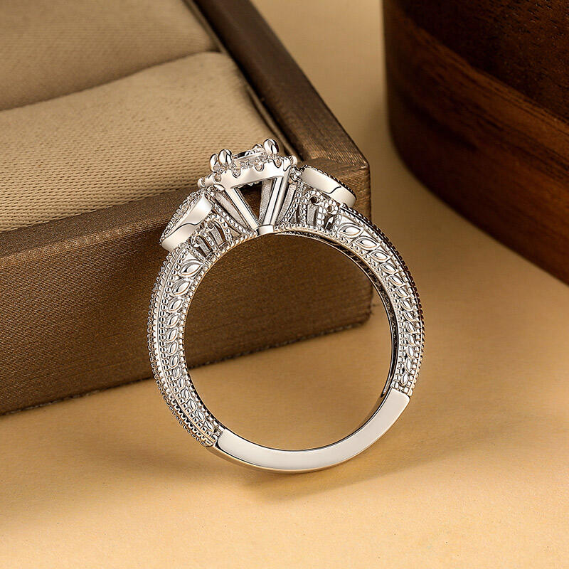 Jeulia classic custom halo three stone wedding eternity ring, three stones orbit a central halo, their alignment plotting past, present, and future like celestial waypoint. The middle gem, slightly larger, anchors the trio while the halo fractures its light into prismatic echoes. Choose each stone’s hue to mark chapters: lavender for first dances, emerald for shared gardens, ruby for whispered midnight. A custom wedding ring to your future life, where every glance downward becomes a timeline unearthed.