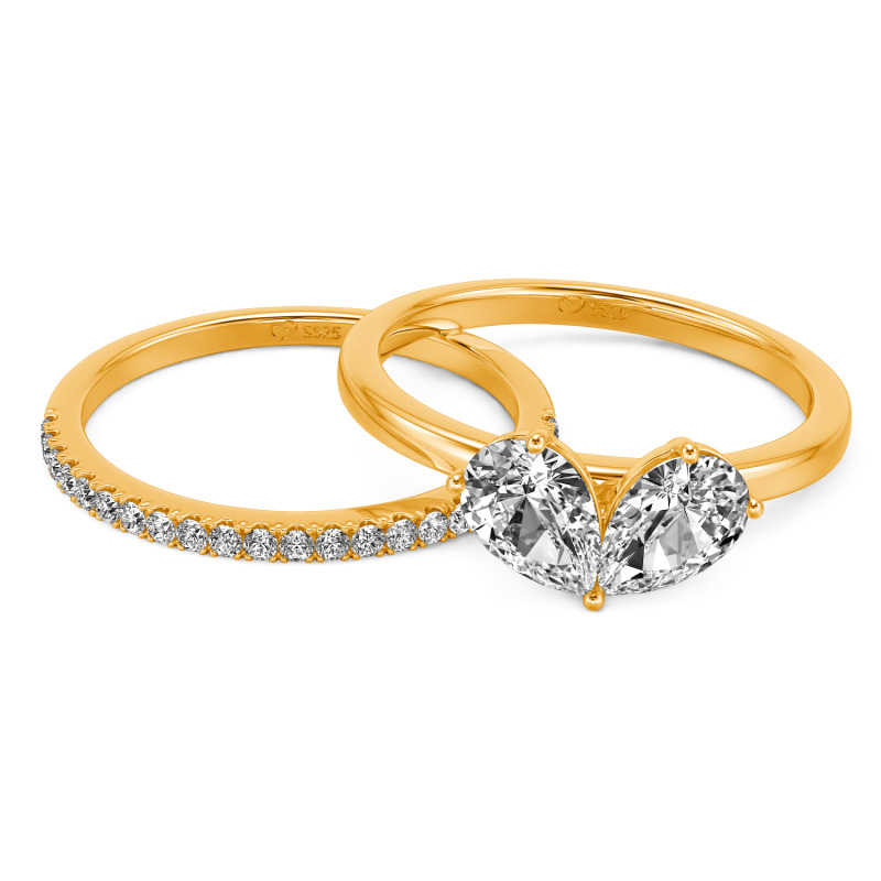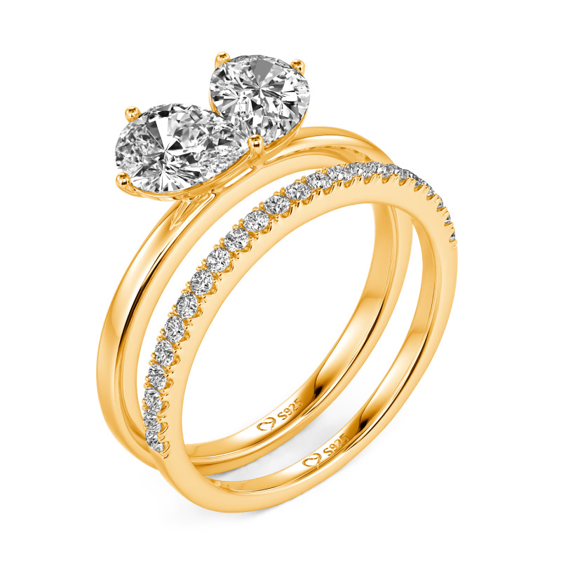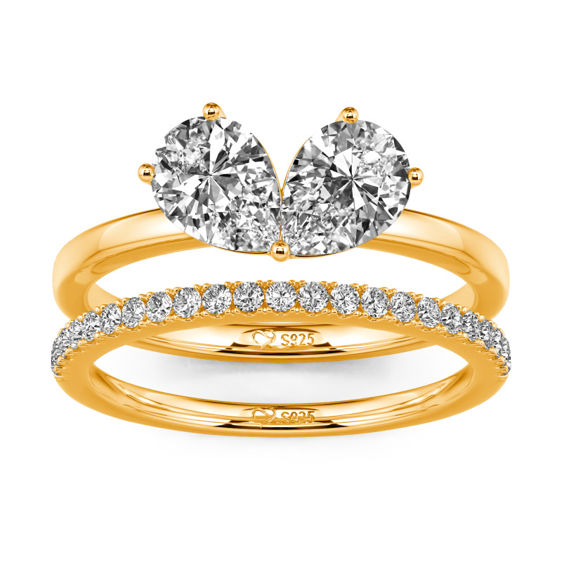 This Jeulia Classic Custom Two Stone Heart Ring Set features two tapered pear gems that fuse into a seamless hear. Customize with your choice of hues (ruby dusk + sapphire midnight) on rose gold, yellow gold, or platinum bands. The enhancer nestles below, its pavé zircons scattering light like stardust ashes. Stack the two tone ring set for kaleidoscopic vows, or wear solo: the heart still beats, the enhancer still remembers.