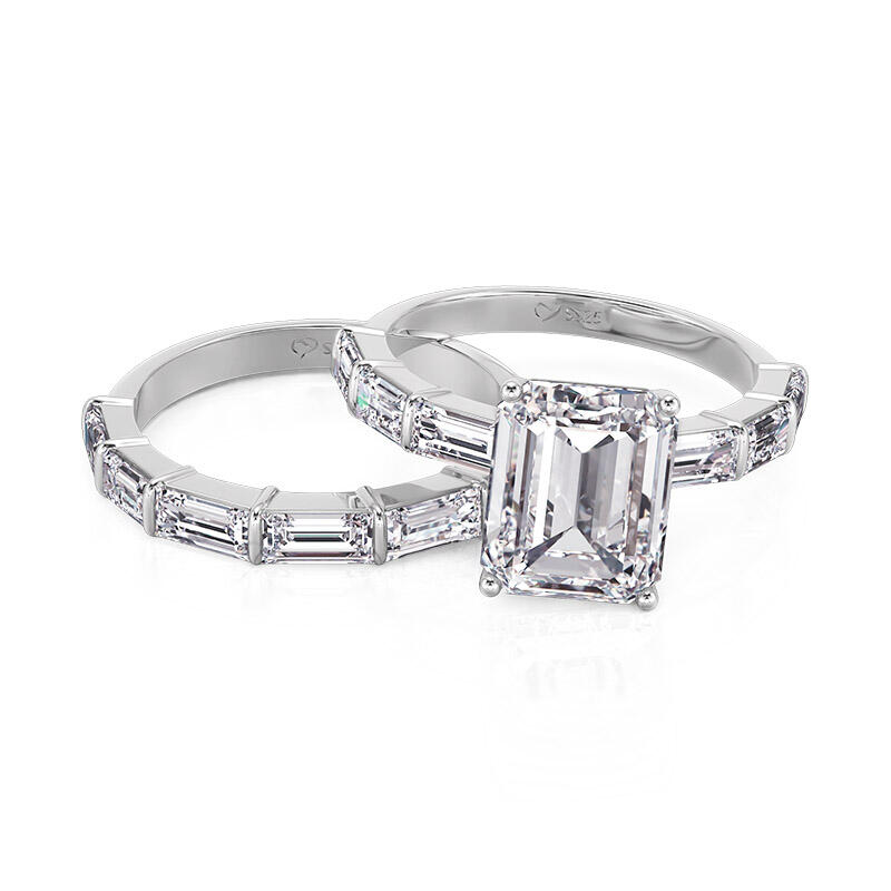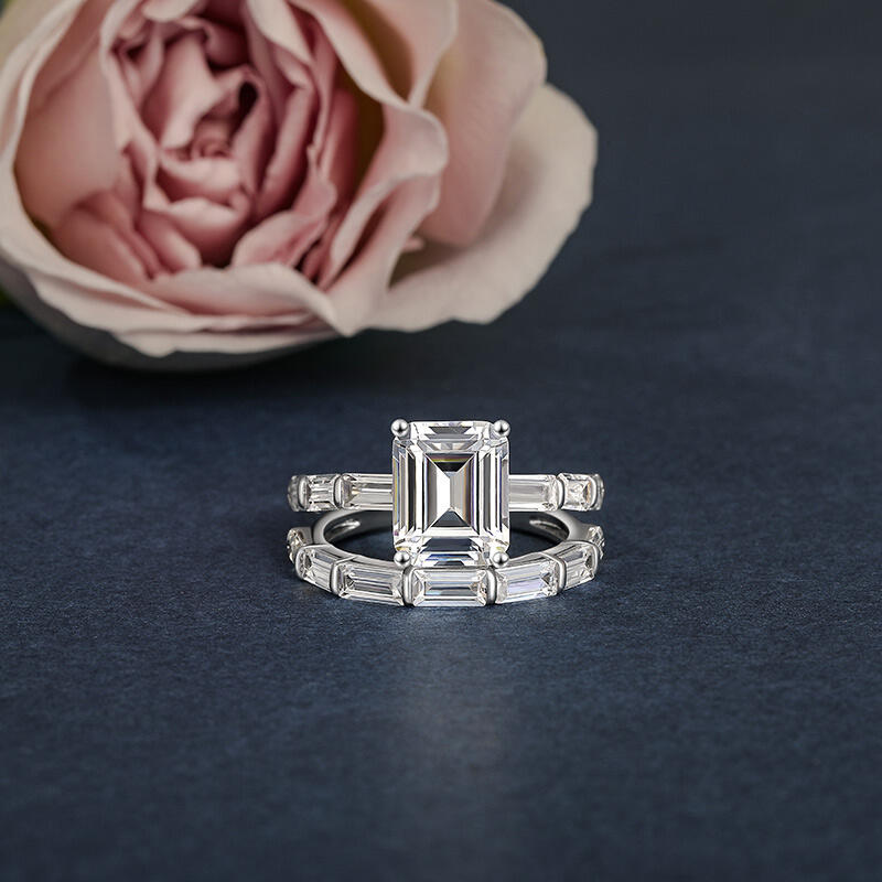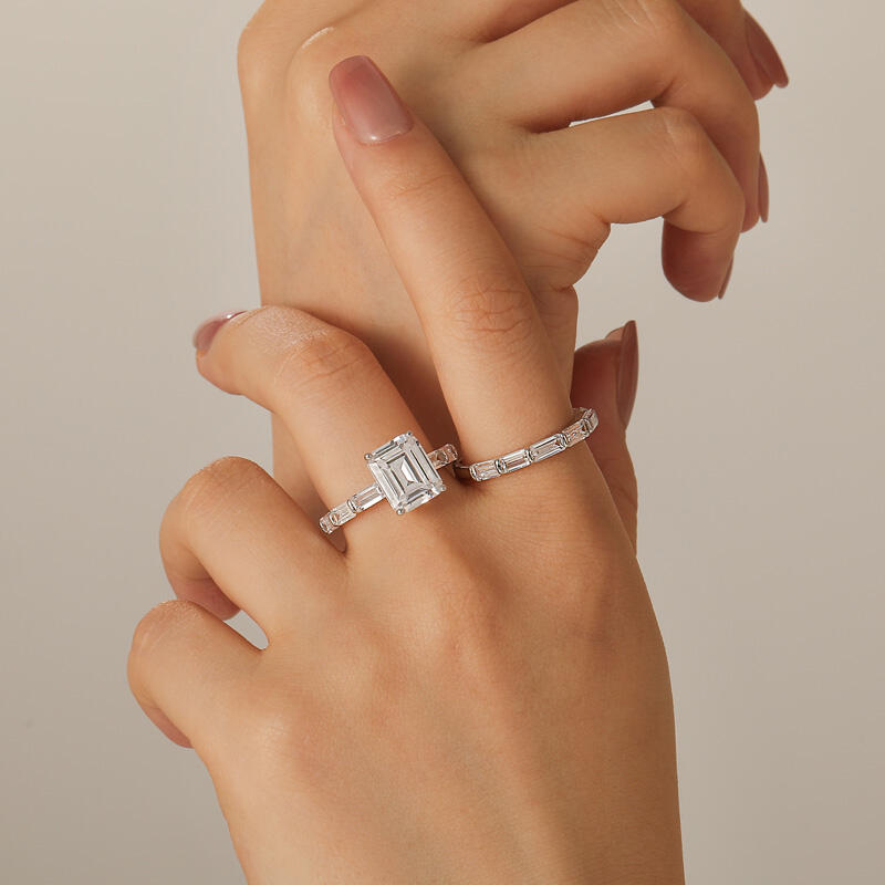 This classic 925 sterling silver engagement ring set with pave setting features a timelessly classic emerald cut as the main stone for an air of understated luxury. The center main stone features the iconic step cut, whose translucent table and unique hall-of-mirrors effect reveals an elegant and restrained radiance. The arms of the emerald cut engagement ring set are precision-set with a row of rectangular-cut secondary stones using an innovative semi-wrapped setting technique, which ensures the safety of the stones while allowing the light to be refracted from multiple angles. The secondary ring in the set continues the geometric language of the main ring, adopting a simple straight line design, which can be worn alone to show a competent temperament, or stacked with the main ring to enhance the sense of visual hierarchy. With the purest lines, it speaks of the most enduring promise of love.