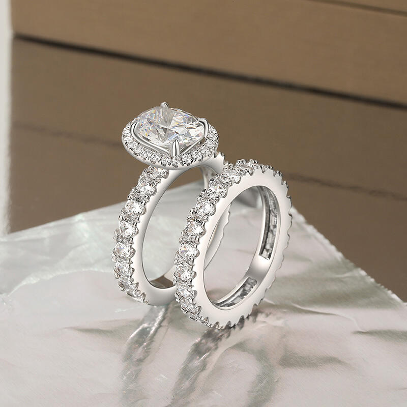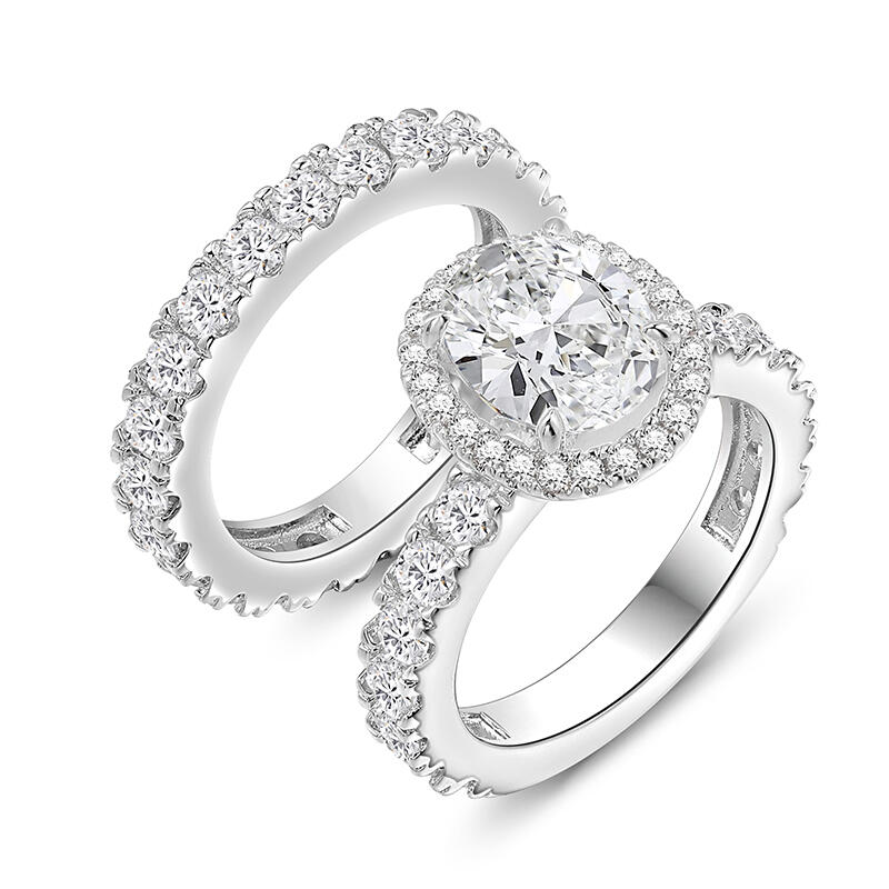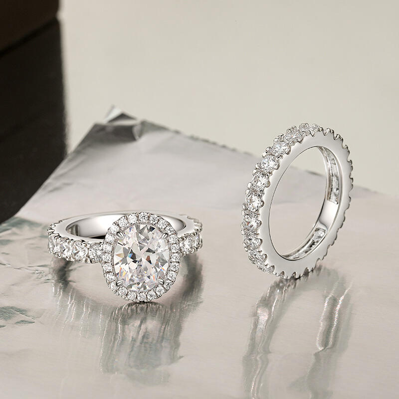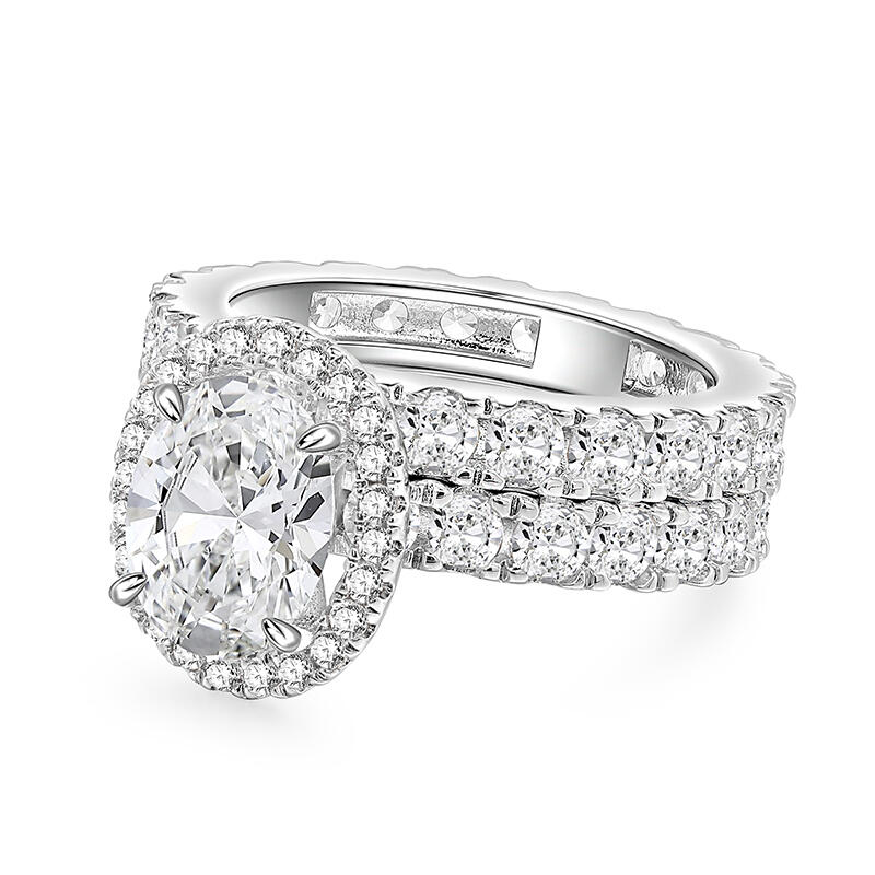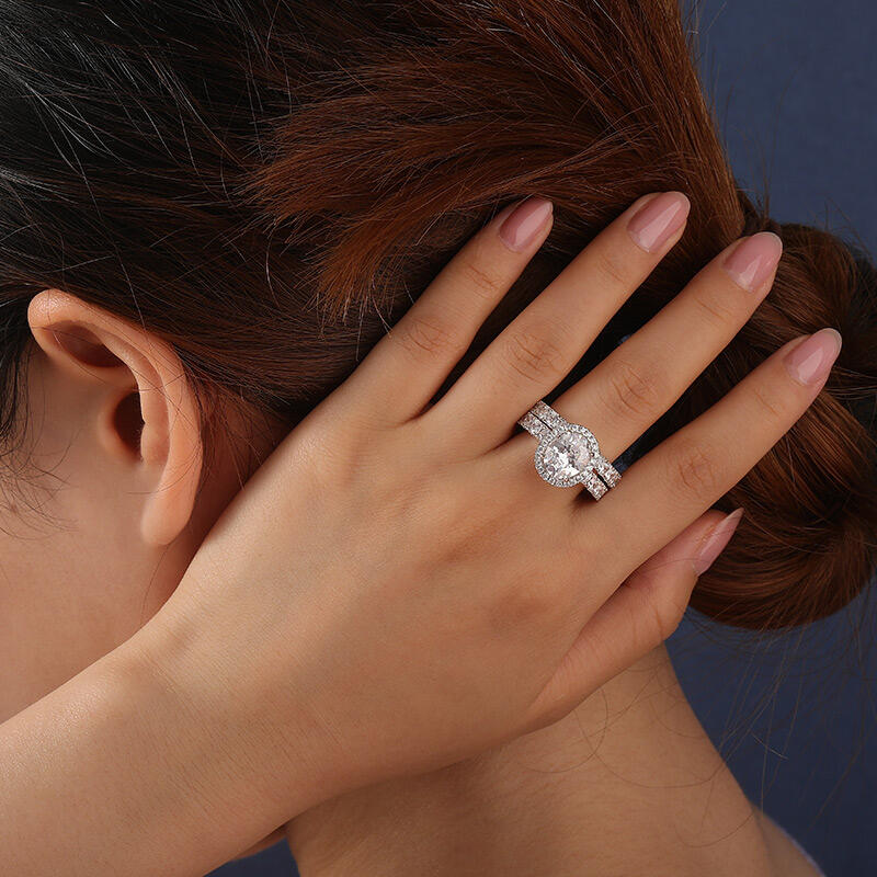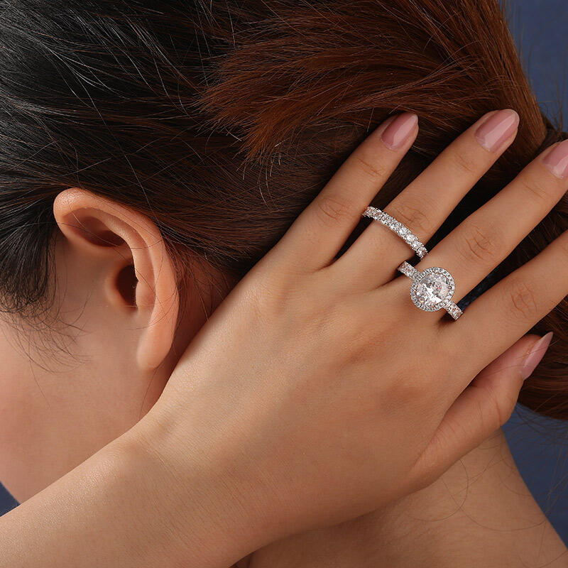 This classic halo oval cut engagement ring set is a timeless piece that exudes elegance and sophistication. Crafted from sterling silver, the engagement ring set boasts a lustrous shine that is sure to catch the eye. At the center of the ring lies a oval-cut stone. The smaller stones in the halo setting also enhance the beauty of the center stone, making it appear larger and more impressive. The shank of the halo engagement ring is set with a full circle of stunning stones. The classic engagement ring set is comfortable to wear and has a smooth interior that glides easily over the finger. The oval engagement rings is a perfect symbol of love and devotion, and its timeless design will never go out of style.