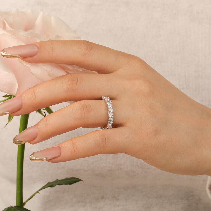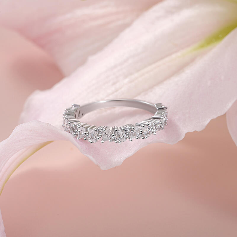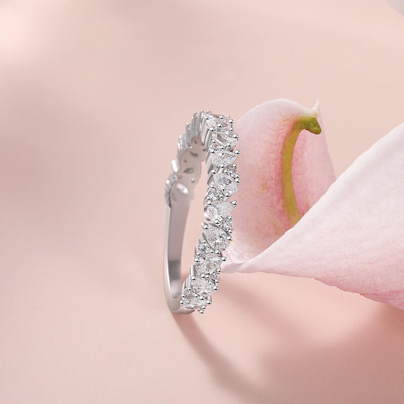 A beautiful classic leaf custom women's half eternity band exudes dreamy, glamorous femininity and romance. Surrounding the band of the women's wedding ring is a row of scattered round and pear-shaped stones. These carefully chosen stones sparkle in the light and shine like starlight. The designer has skillfully interwoven the round and pear-shaped diamonds to create a dynamic and fluid visual effect. The irregular arrangement of the stones gives the classic custom women ring a natural elegance and a unique charm. This women's eternity band can also be customized with stone color and metal color to create a one-of-a-kind ring that reads like you.