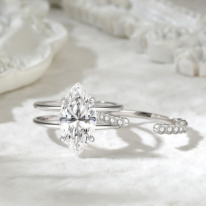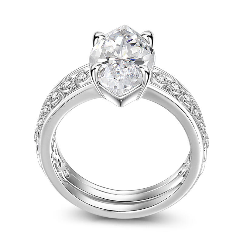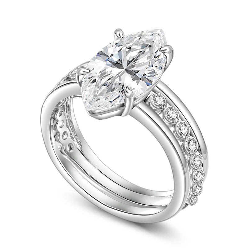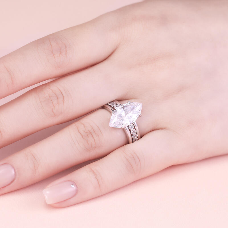 This gorgeous marquise engagement ring set shows off an extraordinary aura with its grand design and superb craftsmanship. The whole consists of a large main stone suite, with the main stone set in a selected sterling silver texture, and the walls of the ring are a brilliant silver color, adding a regal and elegant vibe to the overall look. The design of the marquise ring is both classic and modern, making it a showstopper for everyday wear or special occasions.