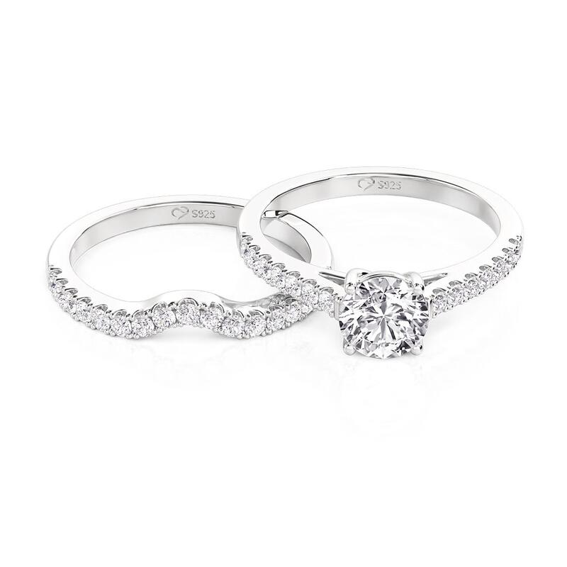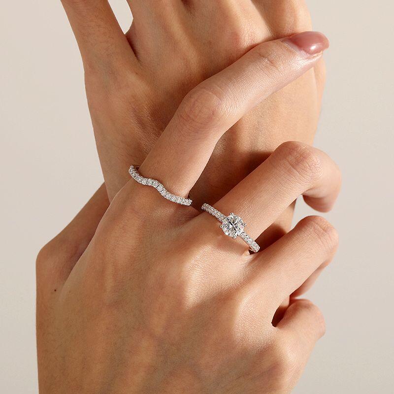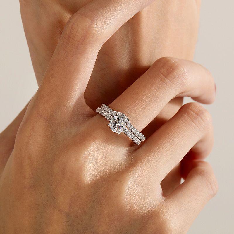 A solitaire band meets its partner—a wave of pavé-set stones that ripples like light on water. Wear them stacked to blend structure with flow, or separately for days that call for quiet elegance. Two rings, one rhythm. Discover the art of adaptable grace with the Jeulia Classic Round Bridal Set, featuring a pavé band.