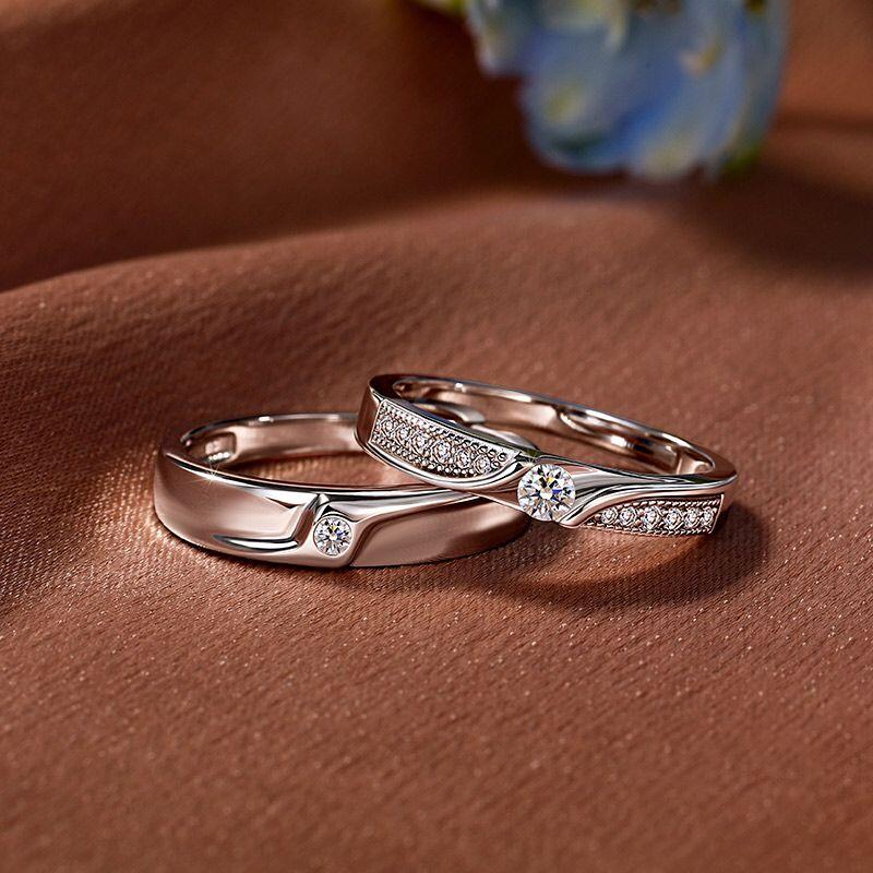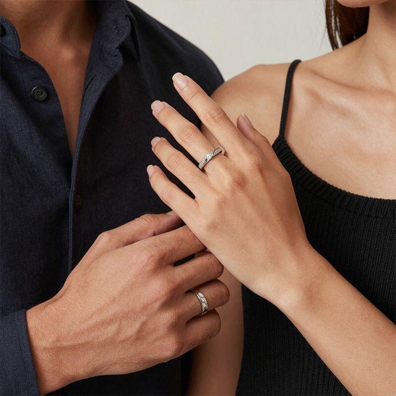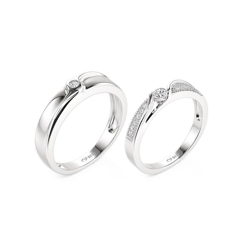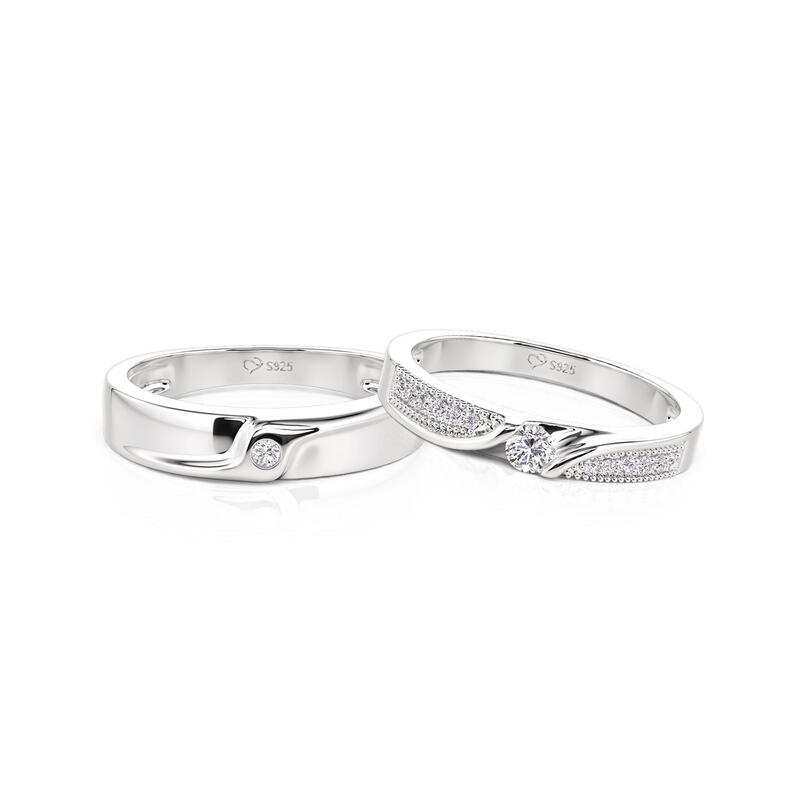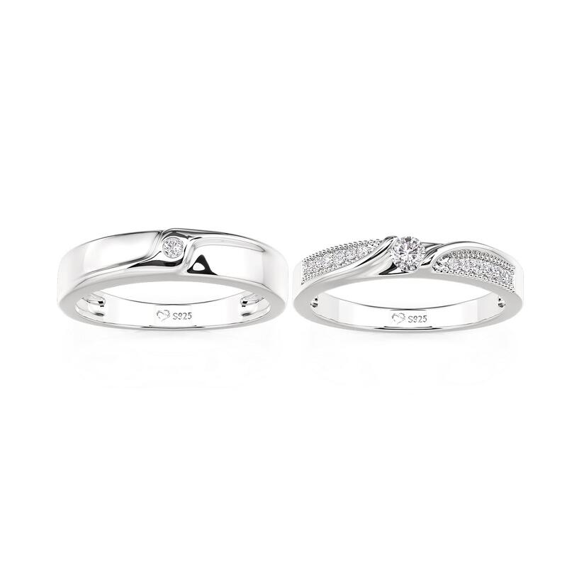 Her ring winds with pavé-set bands around a luminous center stone; his rests in quiet contrast with a single gem along a sleek, polished curve. Worn together, this silver couple's ring set mirrors a balance—hers speaks in sparkles, his in silence, yet both tell the same story in metals that match.