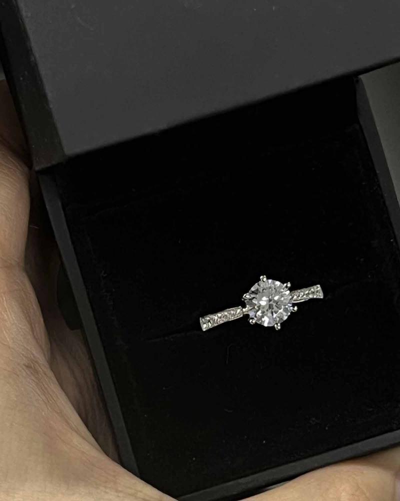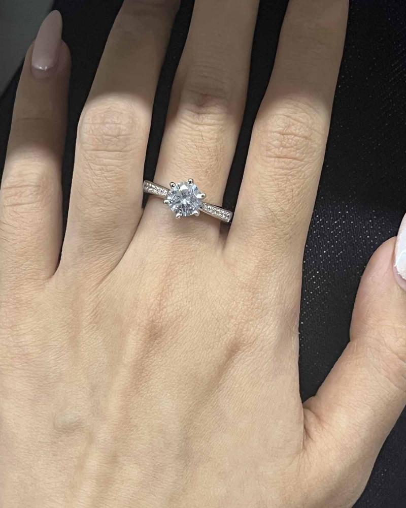 Simple and stunning, this ring showcases a magnificent round cut stone standing tall in the traditional six-prong setting, while additional round stones line the shank. So elegant, it needs no further accompaniment. The stones in this engagement ring shine brightly enough to be deserving as a symbol of your love.