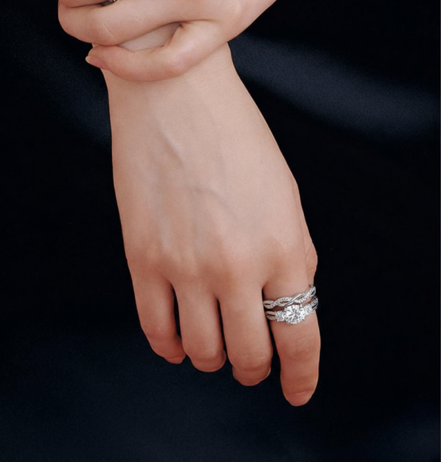 A classic three-stone band glows with a round center gem and pavé-lined shoulders, while its twist-set partner spirals with micro-set stones that catch light like woven starlight. Paired, The Jeulia Classic Twist Round Three-Stone Ring Set balances timeless elegance with dynamic texture—a duet of brilliance designed for layering or standing alone with quiet confidence.