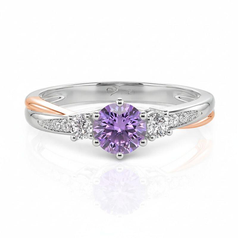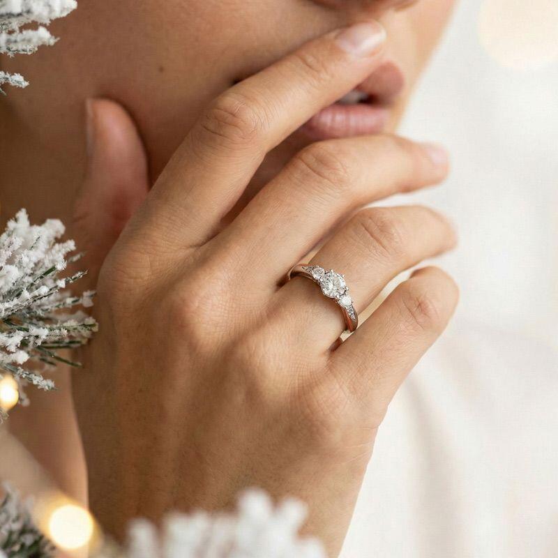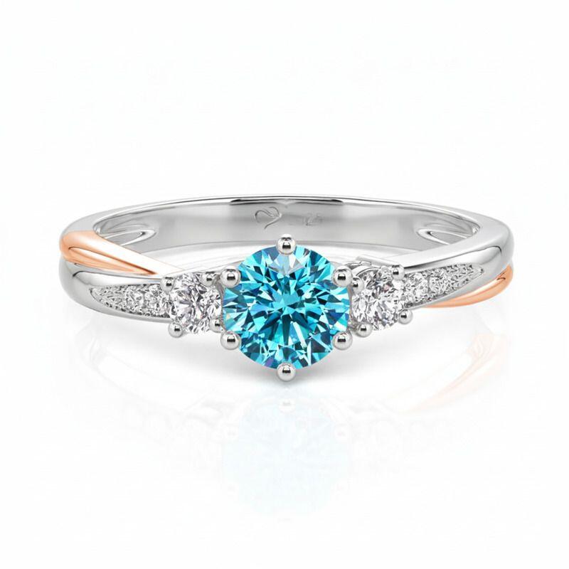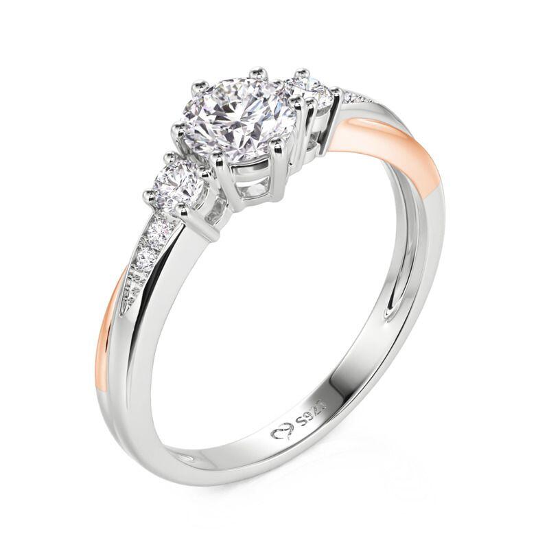 This Jeulia Classic Two-Tone Twist Round Three-Stone Engagement Ring reimagines the timeless three-stone design with a modern flair through its elegant bypass structure and dual-tone interplay. Three round center stones are artfully staggered, while gold and silver lines twist around the finger like threads of destiny. This arrangement amplifies the brilliance of the stones while imparting a dynamic visual rhythm to the entire design. The silhouette breathes new life into timeless elegance—combining the solemnity of an engagement token with avant-garde modern aesthetics. Perfect for sealing unique vows during pivotal moments, this two tone bypass ring lets love flow eternally within the intertwined play of light and shadow.
