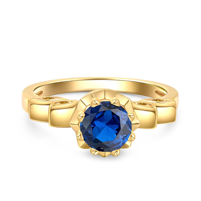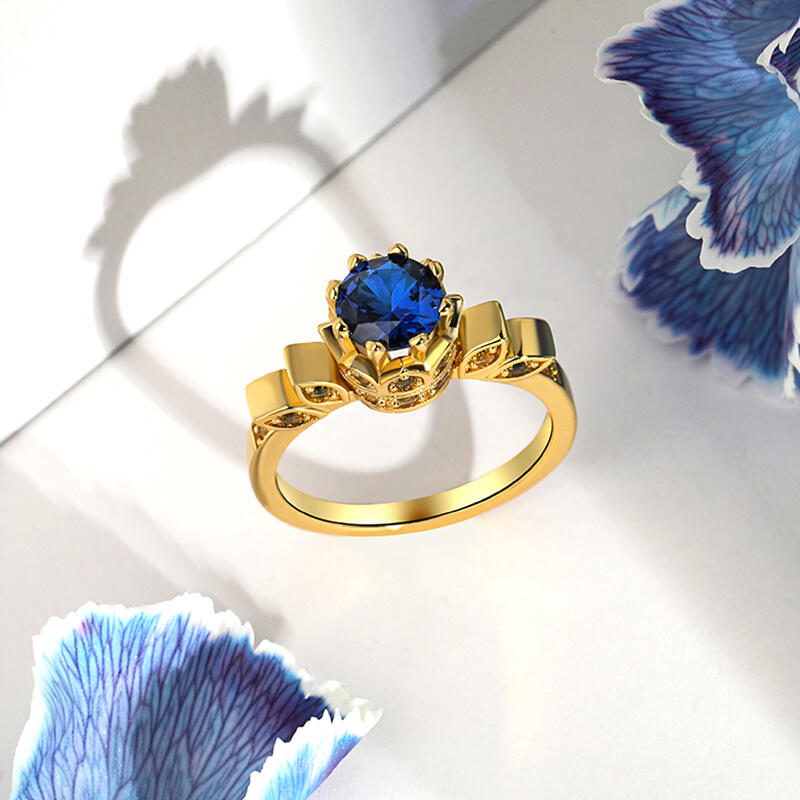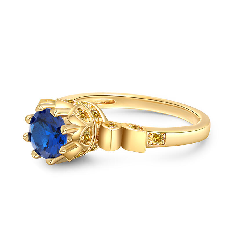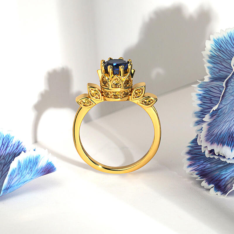 This cool art deco crown-shaped engagement ring boasts a captivating, deep blue center stone, accentuated by dazzling yellow side stones. Inspired by a beautiful story. A young princess with magical long hair who has been imprisoned in a tower by an evil witch for years. With the help of a charming thief, she escapes her confinement and embarks on an epic adventure filled with humor, heart, and thrilling action, discovering the world outside her tower and ultimately finding her true identity and her place in it. This art deco princess engagement ring symbolizes your power to embrace your role as the queen of your own life.