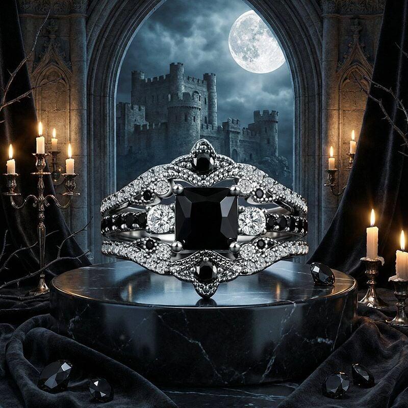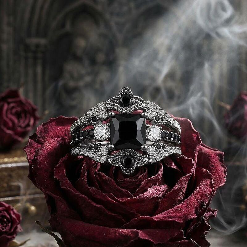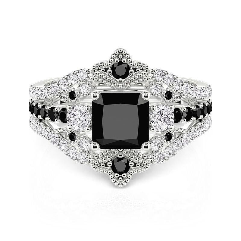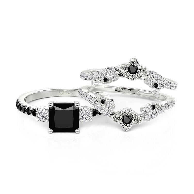 This Jeulia vintage bridal set showcases an integrated nested design, centered on a striking princess-cut black main stone framed by two brilliant white accent stones. The coordinating enhancer wraps around the main ring in an ornate crown silhouette, detailed with black and white pavé stones and vintage-inspired beaded edging. Crafted in polished sterling silver, the layered design amplifies depth and contrast for a bold yet refined look. Perfect for engagements, anniversaries, or everyday elegance, this black ring set blends timeless three-stone symbolism with regal crown detailing—an unforgettable statement for those who love distinctive style.