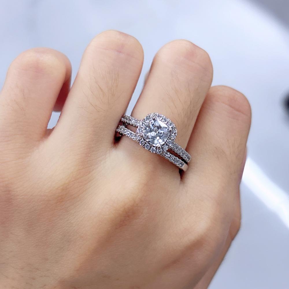Celebrate your love with the Jeulia pave set cushion cut halo engagement ring set. At the heart of the ring, a dazzling cushion - cut stone takes center stage, encircled by a halo of shimmering pave - set stones that amplify its brilliance. The rings feature sleek, pave - set straight bands that add a touch of refined elegance. Perfect for engagements, this halo ring set seamlessly blends timeless design with sparkling detail, making it an ideal symbol of your eternal bond. Whether worn together for a coordinated look or separately to suit different moments, these eternity rings are sure to captivate and charm.