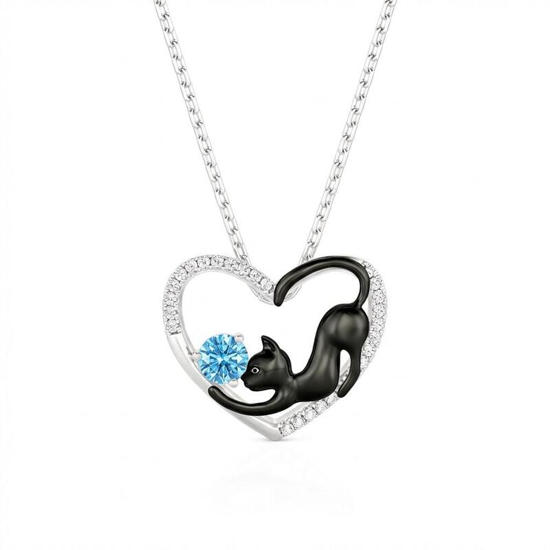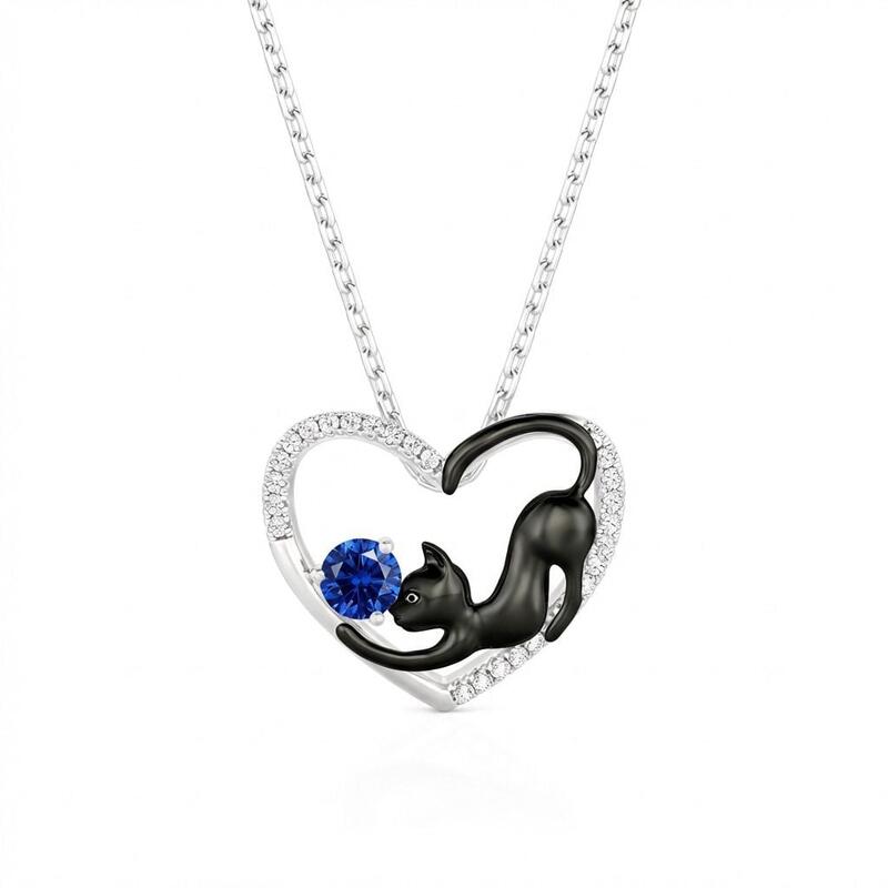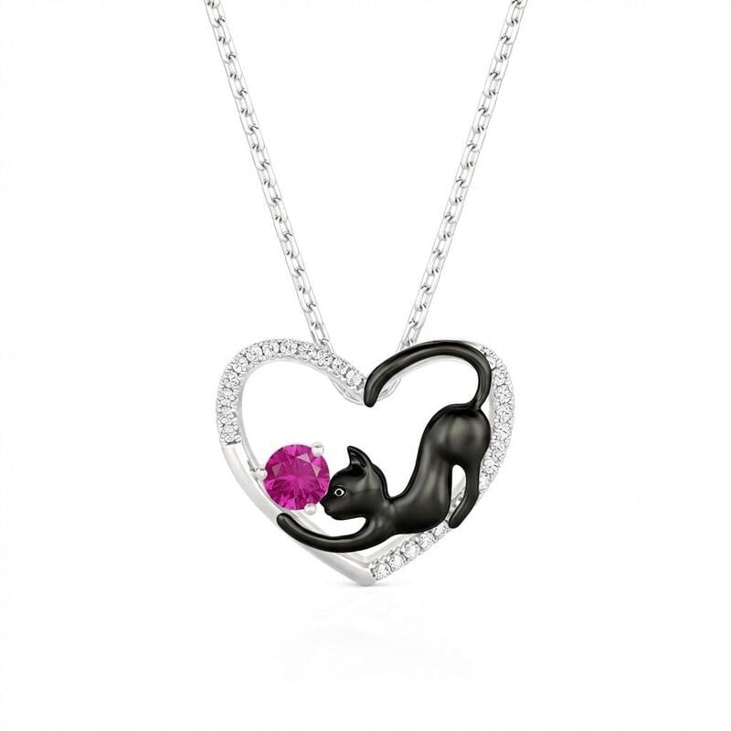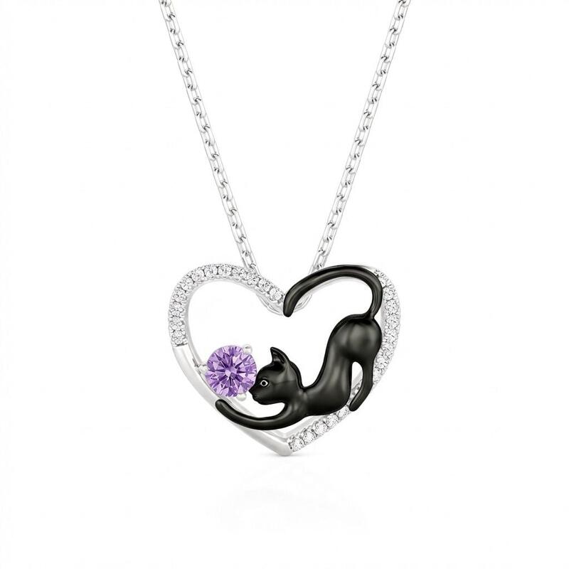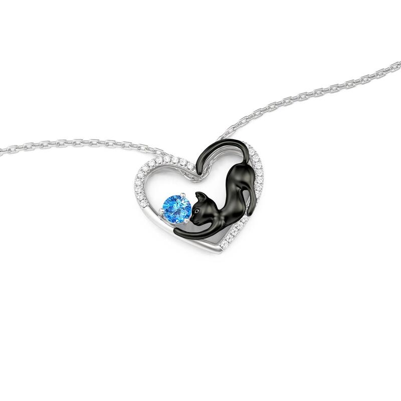 Jeulia Custom Black Cat Heart Necklace with Birthstone