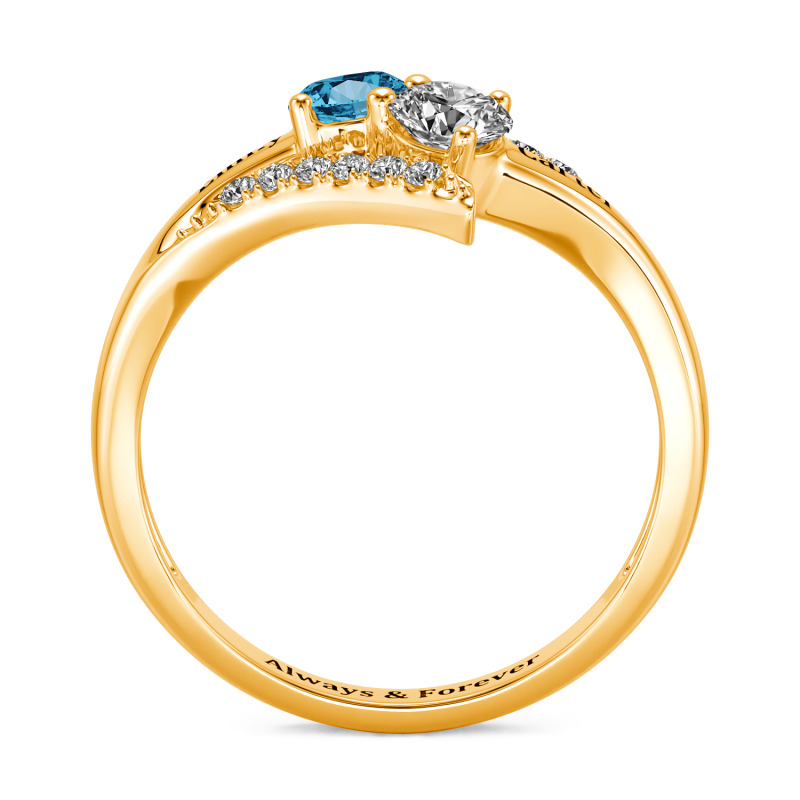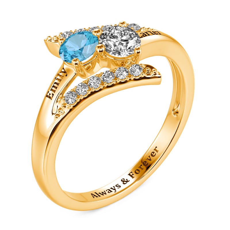 The Jeulia custom bypass two stone name ring features Two gems orbiting apart yet bound by bypassing bands, the space between them etched with names only your hearts decipher. The stones—one icy moonstone, one fiery spinel—mark your duality, while the engraved letters catch light like fingerprints on glass. No overlap, no fusion; just parallel paths choosing closeness. Wear this two stone name engraved ring to remember: love thrives where independence and intimacy share a hyphen.