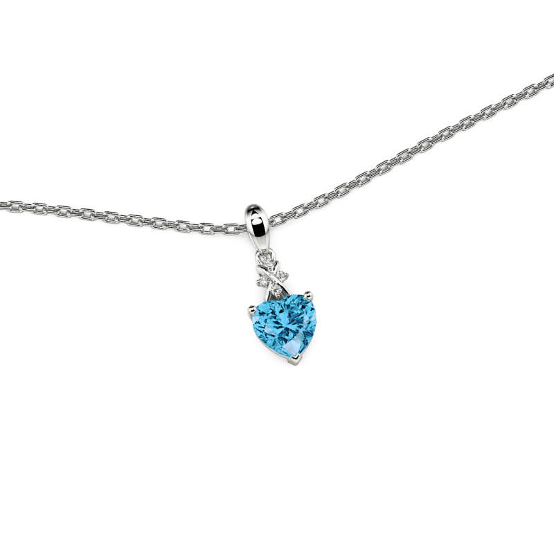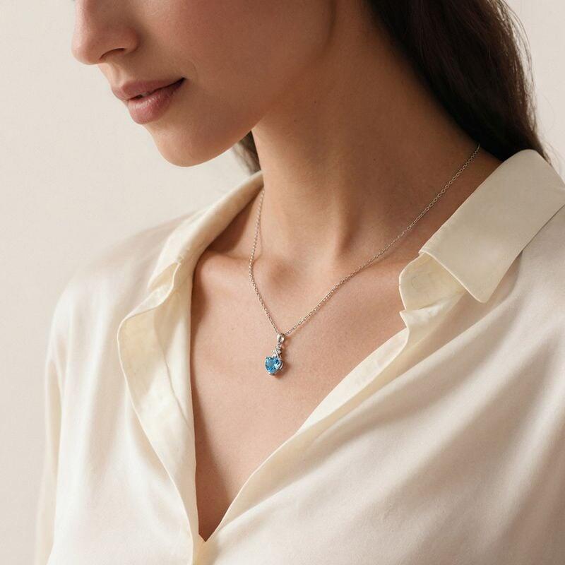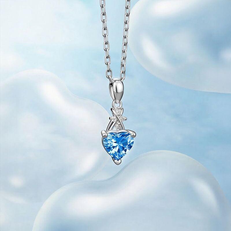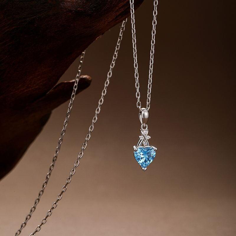 An infinity symbol, paved with tiny sparkling stones, curves above a heart-cut blue gem. Its four-prong setting lets light dance through clear depths—two eternal shapes becoming one story. Available in your choice of metal and stone color. Wear this infinity necklace as a declaration that some love doesn't just last—it loops back, growing stronger with every return.