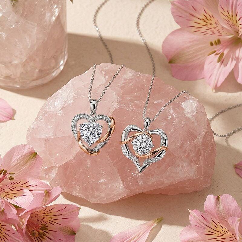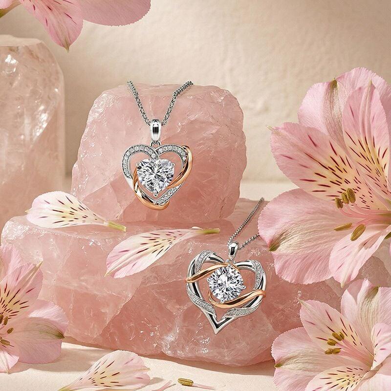 This timeless two-tone heart necklace set from Jeulia celebrates the unbreakable bond between mother and daughter. Crafted in sterling silver with warm rose gold accents, each pendant features a luminous center stone framed by interwoven heart designs edged with delicate pavé stones. The flowing rose gold ribbons wrap around the silver hearts, symbolizing the endless care that connects them. Lightweight and versatile, these mother daughter necklaces are designed for everyday wear—a meaningful gift that honors a lifelong relationship, perfect for Mother’s Day or any moment that calls for celebrating love that lasts.